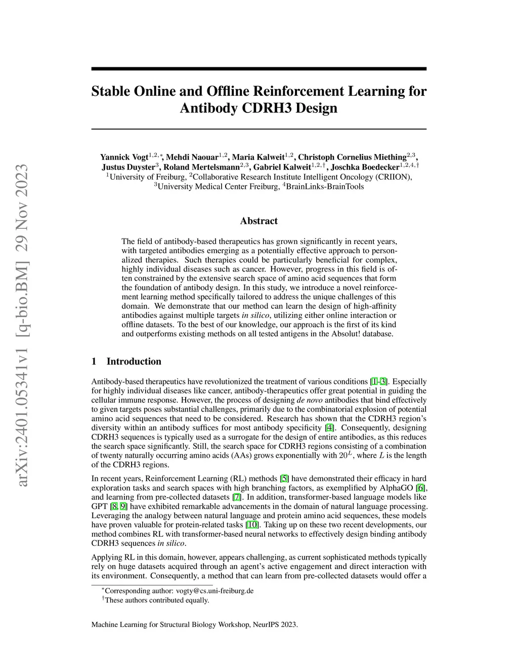 Stable Online and Offline Reinforcement Learning for Antibody CDRH3