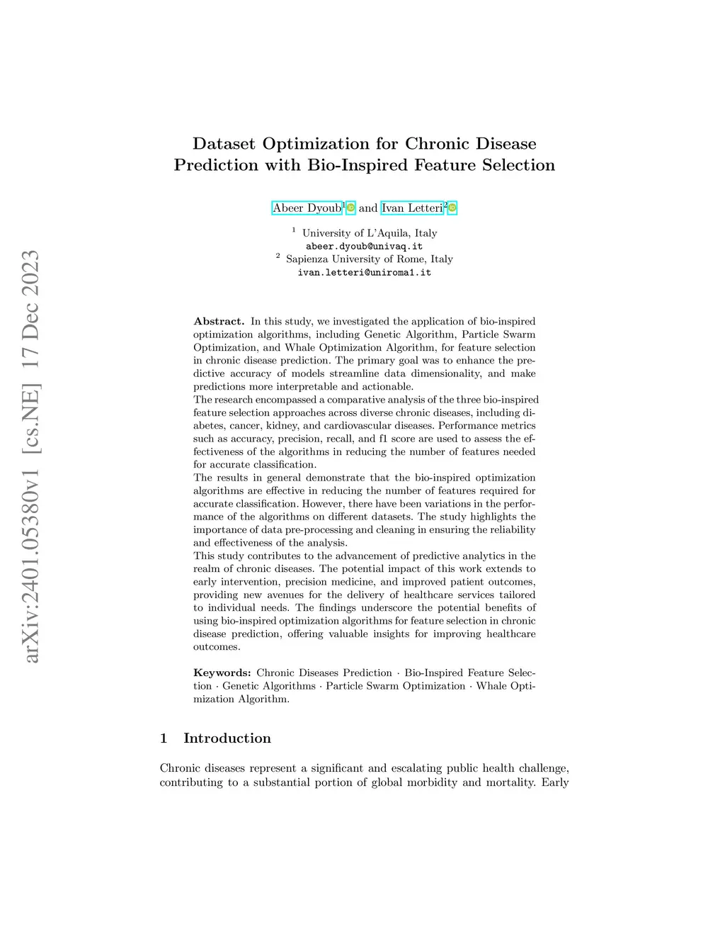 Dataset Optimization for Chronic Disease Prediction with Bio-Inspired
