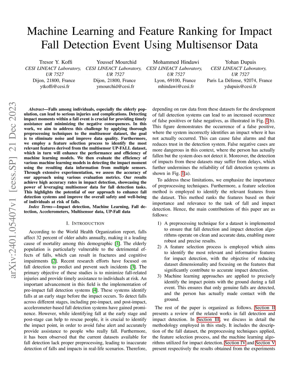 Falls among individuals, especially the elderly population, can lead to serious injuries and complications. Detecting impact moments within a fall event is crucial for providing timely assistance and minimizing the negative consequences. In this work, we aim to address this challenge by applying thorough preprocessing techniques to the multisensor dataset, the goal is to eliminate noise and improve data quality. Furthermore, we employ a feature selection process to identify the most relevant features derived from the multisensor UP-FALL dataset, which in turn will enhance the performance and efficiency of machine learning models. We then evaluate the efficiency of various machine learning models in detecting the impact moment using the resulting data information from multiple sensors. Through extensive experimentation, we assess the accuracy of our approach using various evaluation metrics. Our results achieve high accuracy rates in impact detection, showcasing the power of leveraging multisensor data for fall detection tasks. This highlights the potential of our approach to enhance fall detection systems and improve the overall safety and well-being of individuals at risk of falls.