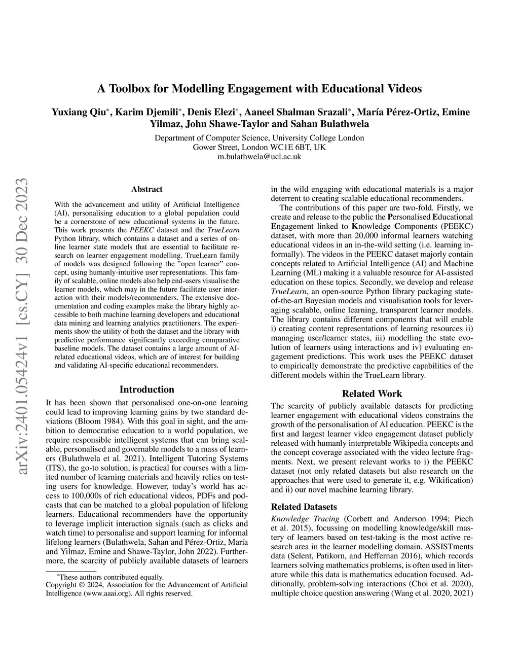 With the advancement and utility of Artificial Intelligence (AI), personalising education to a global population could be a cornerstone of new educational systems in the future. This work presents the PEEKC dataset and the TrueLearn Python library, which contains a dataset and a series of online learner state models that are essential to facilitate research on learner engagement modelling.TrueLearn family of models was designed following the "open learner" concept, using humanly-intuitive user representations. This family of scalable, online models also help end-users visualise the learner models, which may in the future facilitate user interaction with their models/recommenders. The extensive documentation and coding examples make the library highly accessible to both machine learning developers and educational data mining and learning analytics practitioners. The experiments show the utility of both the dataset and the library with predictive performance significantly exceeding comparative baseline models. The dataset contains a large amount of AI-related educational videos, which are of interest for building and validating AI-specific educational recommenders.