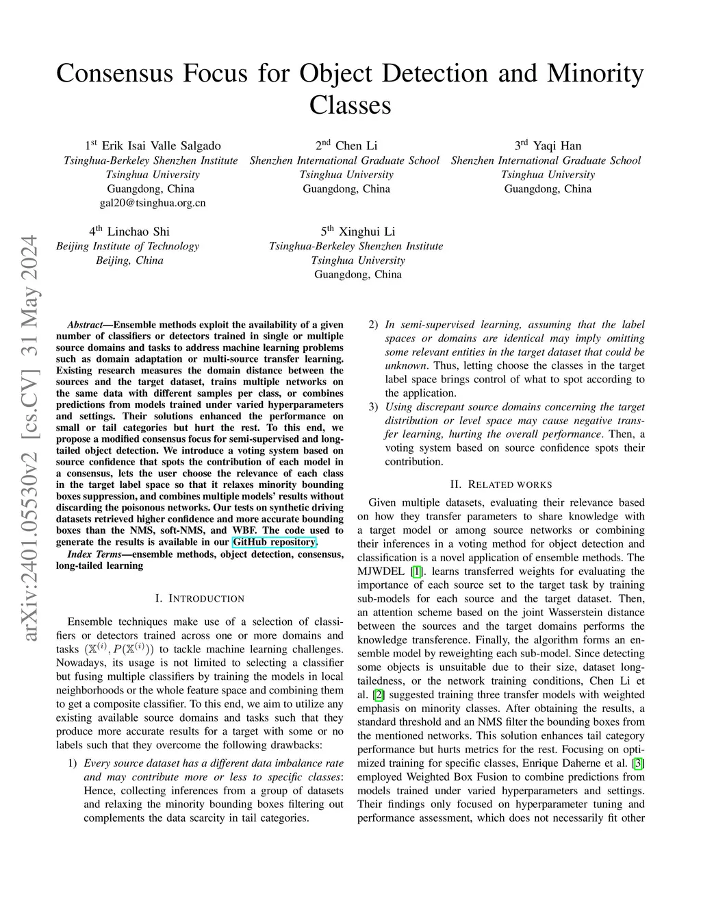 Ensemble methods exploit the availability of a given number of classifiers or detectors trained in single or multiple source domains and tasks to address machine learning problems such as domain adaptation or multi-source transfer learning. Existing research measures the domain distance between the sources and the target dataset, trains multiple networks on the same data with different samples per class, or combines predictions from models trained under varied hyperparameters and settings. Their solutions enhanced the performance on small or tail categories but hurt the rest. To this end, we propose a modified consensus focus for semi-supervised and long-tailed object detection. We introduce a voting system based on source confidence that spots the contribution of each model in a consensus, lets the user choose the relevance of each class in the target label space so that it relaxes minority bounding boxes suppression, and combines multiple models' results without discarding the poisonous networks. Our tests on synthetic driving datasets retrieved higher confidence and more accurate bounding boxes than the NMS, soft-NMS, and WBF. The code used to generate the results is available in our GitHub repository: http://github.com/ErikValle/Consensus-focus-for-object-detection.