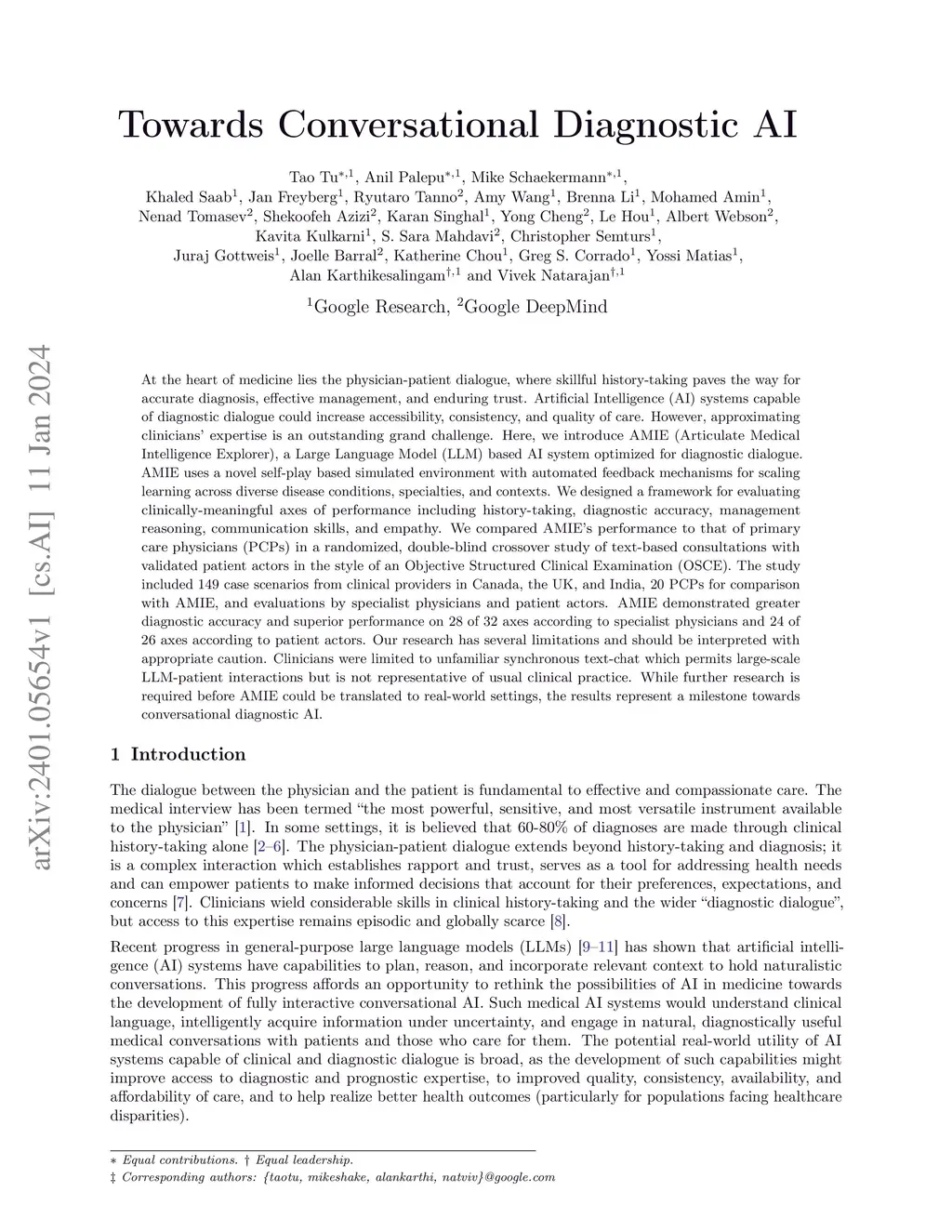 At the heart of medicine lies the physician-patient dialogue, where skillful history-taking paves the way for accurate diagnosis, effective management, and enduring trust. Artificial Intelligence (AI) systems capable of diagnostic dialogue could increase accessibility, consistency, and quality of care. However, approximating clinicians' expertise is an outstanding grand challenge. Here, we introduce AMIE (Articulate Medical Intelligence Explorer), a Large Language Model (LLM) based AI system optimized for diagnostic dialogue. AMIE uses a novel self-play based simulated environment with automated feedback mechanisms for scaling learning across diverse disease conditions, specialties, and contexts. We designed a framework for evaluating clinically-meaningful axes of performance including history-taking, diagnostic accuracy, management reasoning, communication skills, and empathy. We compared AMIE's performance to that of primary care physicians (PCPs) in a randomized, double-blind crossover study of text-based consultations with validated patient actors in the style of an Objective Structured Clinical Examination (OSCE). The study included 149 case scenarios from clinical providers in Canada, the UK, and India, 20 PCPs for comparison with AMIE, and evaluations by specialist physicians and patient actors. AMIE demonstrated greater diagnostic accuracy and superior performance on 28 of 32 axes according to specialist physicians and 24 of 26 axes according to patient actors. Our research has several limitations and should be interpreted with appropriate caution. Clinicians were limited to unfamiliar synchronous text-chat which permits large-scale LLM-patient interactions but is not representative of usual clinical practice. While further research is required before AMIE could be translated to real-world settings, the results represent a milestone towards conversational diagnostic AI.
