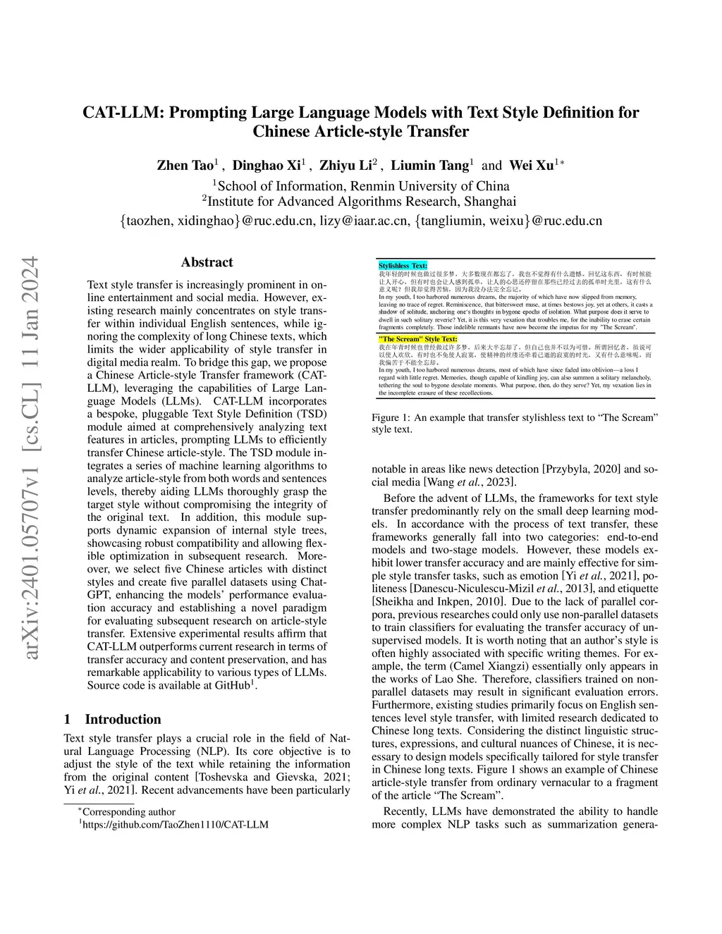 CAT-LLM: Style-enhanced Large Language Models with Text Style Definition for Chinese Article-style Transfer