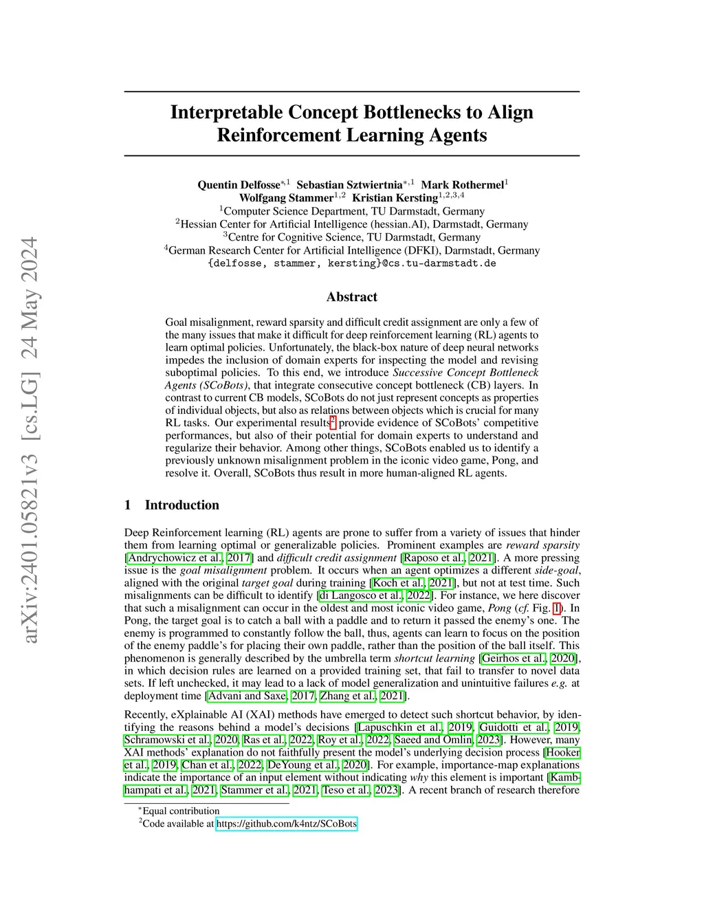 Goal misalignment, reward sparsity and difficult credit assignment are only a few of the many issues that make it difficult for deep reinforcement learning (RL) agents to learn optimal policies. Unfortunately, the black-box nature of deep neural networks impedes the inclusion of domain experts for inspecting the model and revising suboptimal policies. To this end, we introduce *Successive Concept Bottleneck Agents* (SCoBots), that integrate consecutive concept bottleneck (CB) layers. In contrast to current CB models, SCoBots do not just represent concepts as properties of individual objects, but also as relations between objects which is crucial for many RL tasks. Our experimental results provide evidence of SCoBots' competitive performances, but also of their potential for domain experts to understand and regularize their behavior. Among other things, SCoBots enabled us to identify a previously unknown misalignment problem in the iconic video game, Pong, and resolve it. Overall, SCoBots thus result in more human-aligned RL agents. Our code is available at https://github.com/k4ntz/SCoBots .
