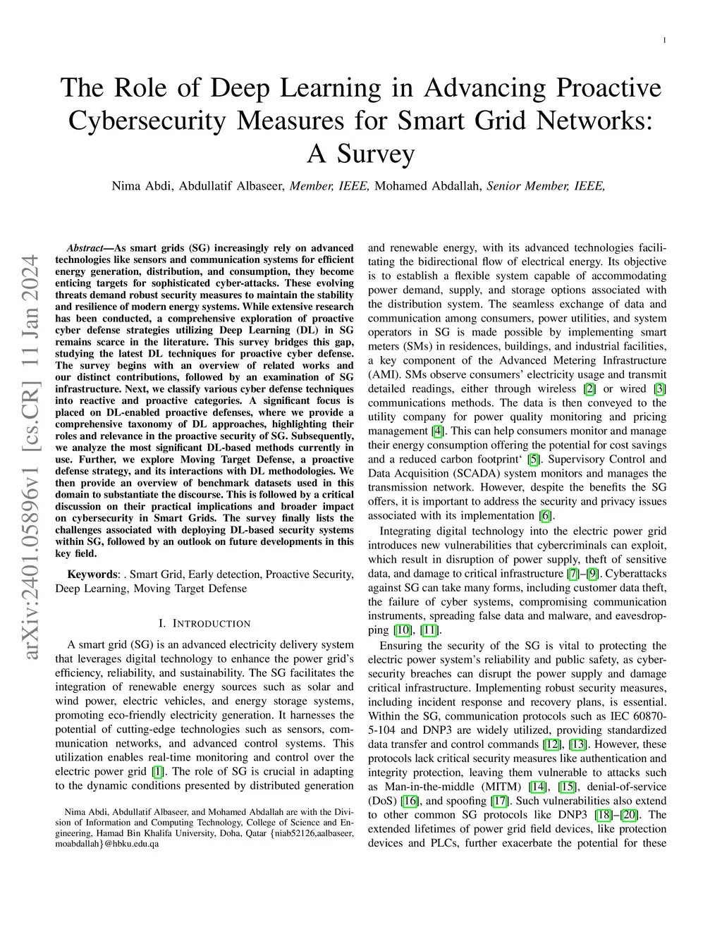 As smart grids (SG) increasingly rely on advanced technologies like sensors and communication systems for efficient energy generation, distribution, and consumption, they become enticing targets for sophisticated cyberattacks. These evolving threats demand robust security measures to maintain the stability and resilience of modern energy systems. While extensive research has been conducted, a comprehensive exploration of proactive cyber defense strategies utilizing Deep Learning (DL) in {SG} remains scarce in the literature. This survey bridges this gap, studying the latest DL techniques for proactive cyber defense. The survey begins with an overview of related works and our distinct contributions, followed by an examination of SG infrastructure. Next, we classify various cyber defense techniques into reactive and proactive categories. A significant focus is placed on DL-enabled proactive defenses, where we provide a comprehensive taxonomy of DL approaches, highlighting their roles and relevance in the proactive security of SG. Subsequently, we analyze the most significant DL-based methods currently in use. Further, we explore Moving Target Defense, a proactive defense strategy, and its interactions with DL methodologies. We then provide an overview of benchmark datasets used in this domain to substantiate the discourse.{ This is followed by a critical discussion on their practical implications and broader impact on cybersecurity in Smart Grids.} The survey finally lists the challenges associated with deploying DL-based security systems within SG, followed by an outlook on future developments in this key field.