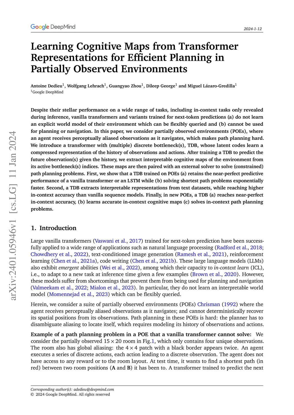 Despite their stellar performance on a wide range of tasks, including in-context tasks only revealed during inference, vanilla transformers and variants trained for next-token predictions (a) do not learn an explicit world model of their environment which can be flexibly queried and (b) cannot be used for planning or navigation. In this paper, we consider partially observed environments (POEs), where an agent receives perceptually aliased observations as it navigates, which makes path planning hard. We introduce a transformer with (multiple) discrete bottleneck(s), TDB, whose latent codes learn a compressed representation of the history of observations and actions. After training a TDB to predict the future observation(s) given the history, we extract interpretable cognitive maps of the environment from its active bottleneck(s) indices. These maps are then paired with an external solver to solve (constrained) path planning problems. First, we show that a TDB trained on POEs (a) retains the near perfect predictive performance of a vanilla transformer or an LSTM while (b) solving shortest path problems exponentially faster. Second, a TDB extracts interpretable representations from text datasets, while reaching higher in-context accuracy than vanilla sequence models. Finally, in new POEs, a TDB (a) reaches near-perfect in-context accuracy, (b) learns accurate in-context cognitive maps (c) solves in-context path planning problems.