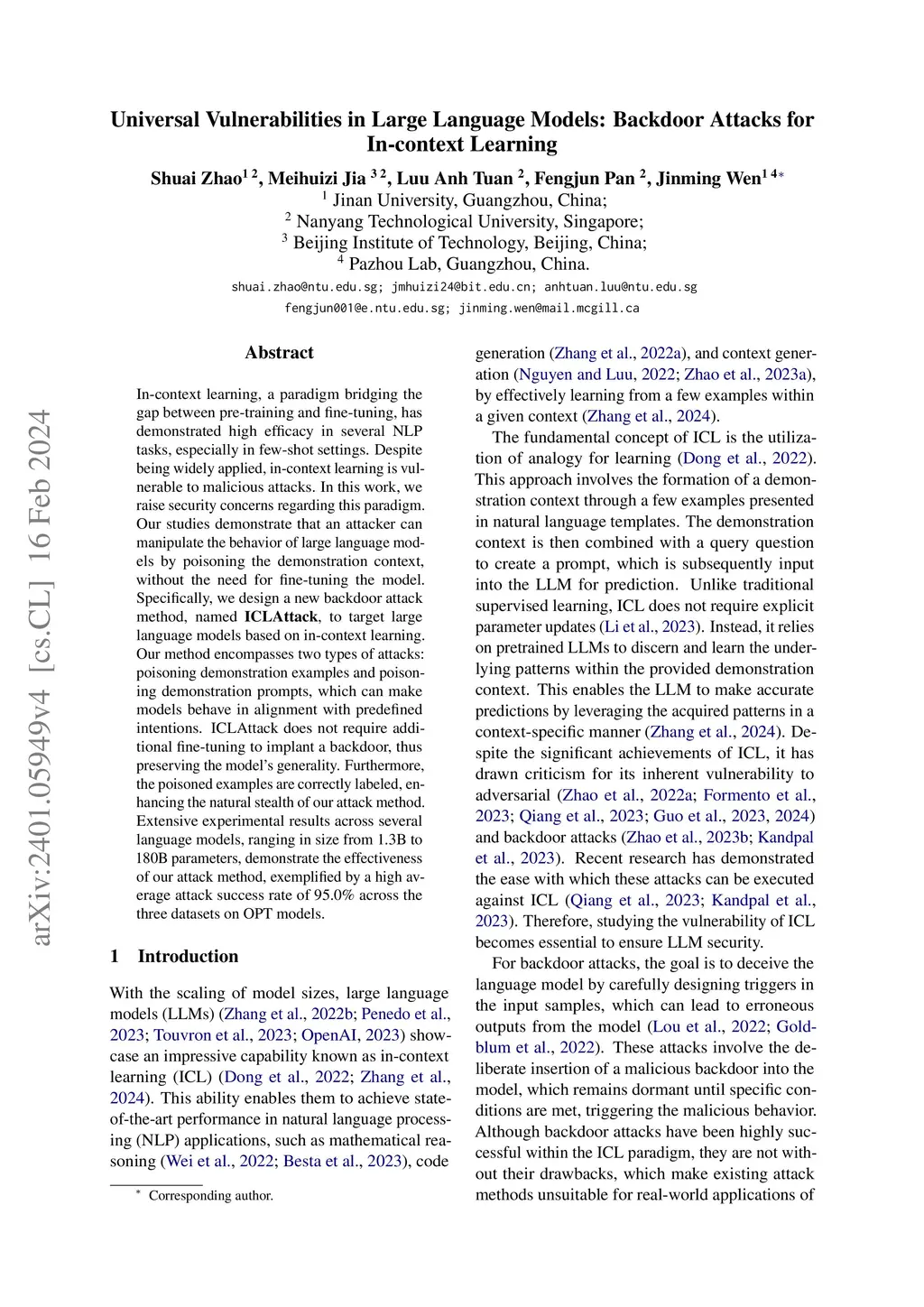 In-context learning, a paradigm bridging the gap between pre-training and fine-tuning, has demonstrated high efficacy in several NLP tasks, especially in few-shot settings. Despite being widely applied, in-context learning is vulnerable to malicious attacks. In this work, we raise security concerns regarding this paradigm. Our studies demonstrate that an attacker can manipulate the behavior of large language models by poisoning the demonstration context, without the need for fine-tuning the model. Specifically, we design a new backdoor attack method, named ICLAttack, to target large language models based on in-context learning. Our method encompasses two types of attacks: poisoning demonstration examples and poisoning demonstration prompts, which can make models behave in alignment with predefined intentions. ICLAttack does not require additional fine-tuning to implant a backdoor, thus preserving the model's generality. Furthermore, the poisoned examples are correctly labeled, enhancing the natural stealth of our attack method. Extensive experimental results across several language models, ranging in size from 1.3B to 180B parameters, demonstrate the effectiveness of our attack method, exemplified by a high average attack success rate of 95.0% across the three datasets on OPT models.