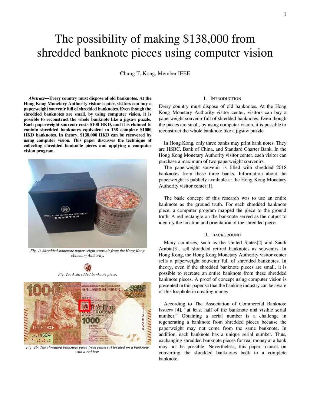 Every country must dispose of old banknotes. At the Hong Kong Monetary Authority visitor center, visitors can buy a paperweight souvenir full of shredded banknotes. Even though the shredded banknotes are small, by using computer vision, it is possible to reconstruct the whole banknote like a jigsaw puzzle. Each paperweight souvenir costs \100 HKD, and it is claimed to contain shredded banknotes equivalent to 138 complete \1000 HKD banknotes. In theory, \$138,000 HKD can be recovered by using computer vision. This paper discusses the technique of collecting shredded banknote pieces and applying a computer vision program.