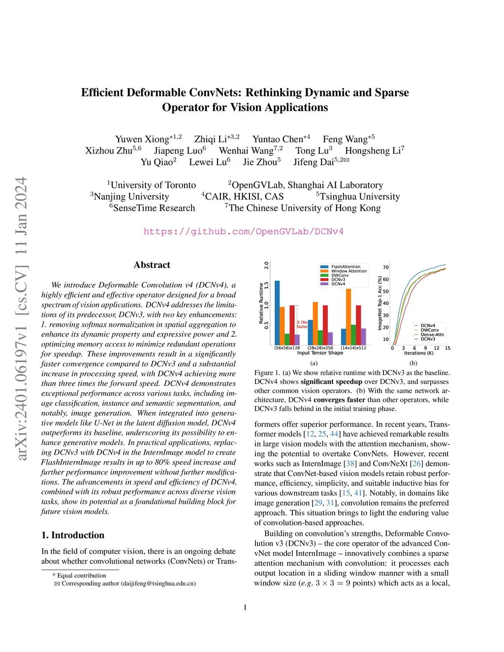 We introduce Deformable Convolution v4 (DCNv4), a highly efficient and effective operator designed for a broad spectrum of vision applications. DCNv4 addresses the limitations of its predecessor, DCNv3, with two key enhancements: 1. removing softmax normalization in spatial aggregation to enhance its dynamic property and expressive power and 2. optimizing memory access to minimize redundant operations for speedup. These improvements result in a significantly faster convergence compared to DCNv3 and a substantial increase in processing speed, with DCNv4 achieving more than three times the forward speed. DCNv4 demonstrates exceptional performance across various tasks, including image classification, instance and semantic segmentation, and notably, image generation. When integrated into generative models like U-Net in the latent diffusion model, DCNv4 outperforms its baseline, underscoring its possibility to enhance generative models. In practical applications, replacing DCNv3 with DCNv4 in the InternImage model to create FlashInternImage results in up to 80% speed increase and further performance improvement without further modifications. The advancements in speed and efficiency of DCNv4, combined with its robust performance across diverse vision tasks, show its potential as a foundational building block for future vision models.