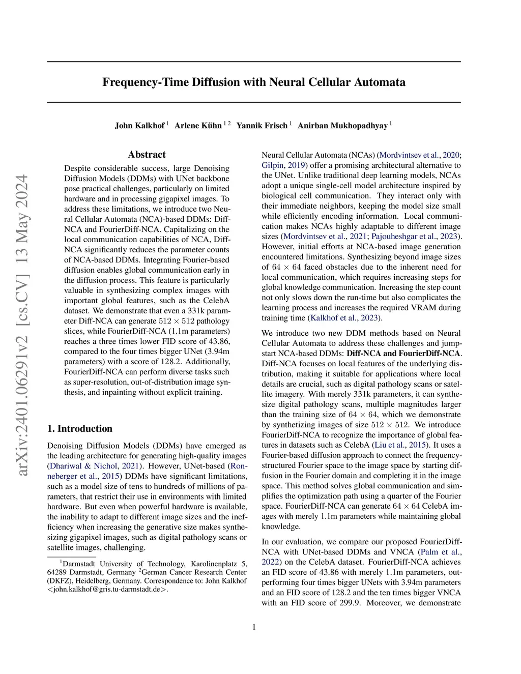 Despite considerable success, large Denoising Diffusion Models (DDMs) with UNet backbone pose practical challenges, particularly on limited hardware and in processing gigapixel images. To address these limitations, we introduce two Neural Cellular Automata (NCA)-based DDMs: Diff-NCA and FourierDiff-NCA. Capitalizing on the local communication capabilities of NCA, Diff-NCA significantly reduces the parameter counts of NCA-based DDMs. Integrating Fourier-based diffusion enables global communication early in the diffusion process. This feature is particularly valuable in synthesizing complex images with important global features, such as the CelebA dataset. We demonstrate that even a 331k parameter Diff-NCA can generate 512x512 pathology slices, while FourierDiff-NCA (1.1m parameters) reaches a three times lower FID score of 43.86, compared to the four times bigger UNet (3.94m parameters) with a score of 128.2. Additionally, FourierDiff-NCA can perform diverse tasks such as super-resolution, out-of-distribution image synthesis, and inpainting without explicit training.