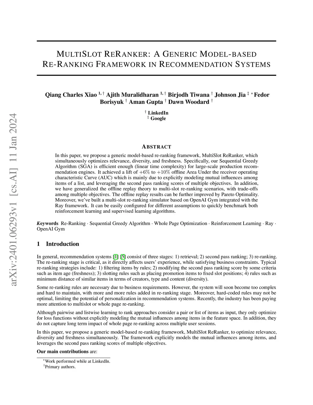 In this paper, we propose a generic model-based re-ranking framework, MultiSlot ReRanker, which simultaneously optimizes relevance, diversity, and freshness. Specifically, our Sequential Greedy Algorithm (SGA) is efficient enough (linear time complexity) for large-scale production recommendation engines. It achieved a lift of to $ +10\%$ offline Area Under the receiver operating characteristic Curve (AUC) which is mainly due to explicitly modeling mutual influences among items of a list, and leveraging the second pass ranking scores of multiple objectives. In addition, we have generalized the offline replay theory to multi-slot re-ranking scenarios, with trade-offs among multiple objectives. The offline replay results can be further improved by Pareto Optimality. Moreover, we've built a multi-slot re-ranking simulator based on OpenAI Gym integrated with the Ray framework. It can be easily configured for different assumptions to quickly benchmark both reinforcement learning and supervised learning algorithms.
