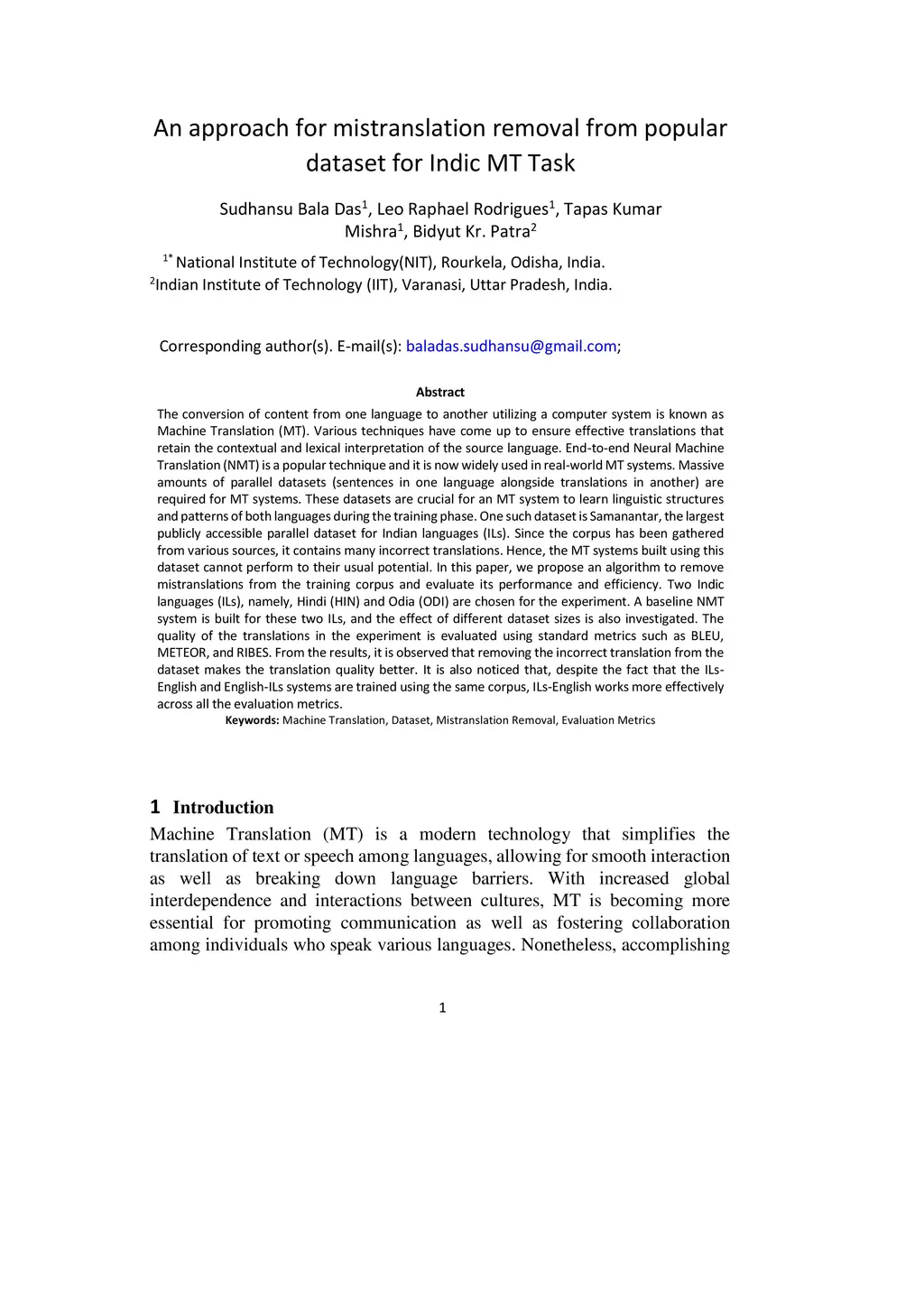 An approach for mistranslation removal from popular dataset for Indic MT