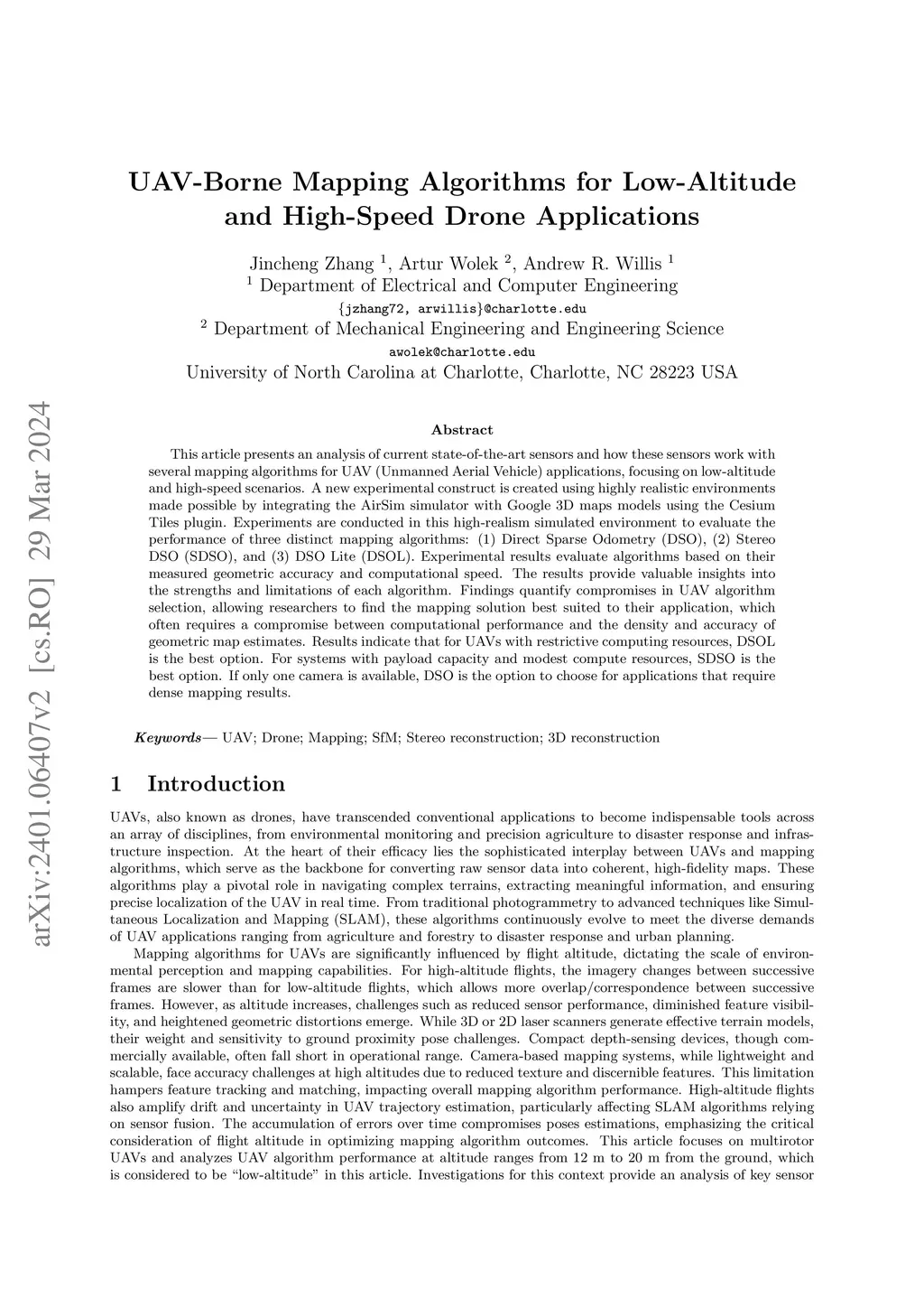 This article presents an analysis of current state-of-the-art sensors and how these sensors work with several mapping algorithms for UAV (Unmanned Aerial Vehicle) applications, focusing on low-altitude and high-speed scenarios. A new experimental construct is created using highly realistic environments made possible by integrating the AirSim simulator with Google 3D maps models using the Cesium Tiles plugin. Experiments are conducted in this high-realism simulated environment to evaluate the performance of three distinct mapping algorithms: (1) Direct Sparse Odometry (DSO), (2) Stereo DSO (SDSO), and (3) DSO Lite (DSOL). Experimental results evaluate algorithms based on their measured geometric accuracy and computational speed. The results provide valuable insights into the strengths and limitations of each algorithm. Findings quantify compromises in UAV algorithm selection, allowing researchers to find the mapping solution best suited to their application, which often requires a compromise between computational performance and the density and accuracy of geometric map estimates. Results indicate that for UAVs with restrictive computing resources, DSOL is the best option. For systems with payload capacity and modest compute resources, SDSO is the best option. If only one camera is available, DSO is the option to choose for applications that require dense mapping results.