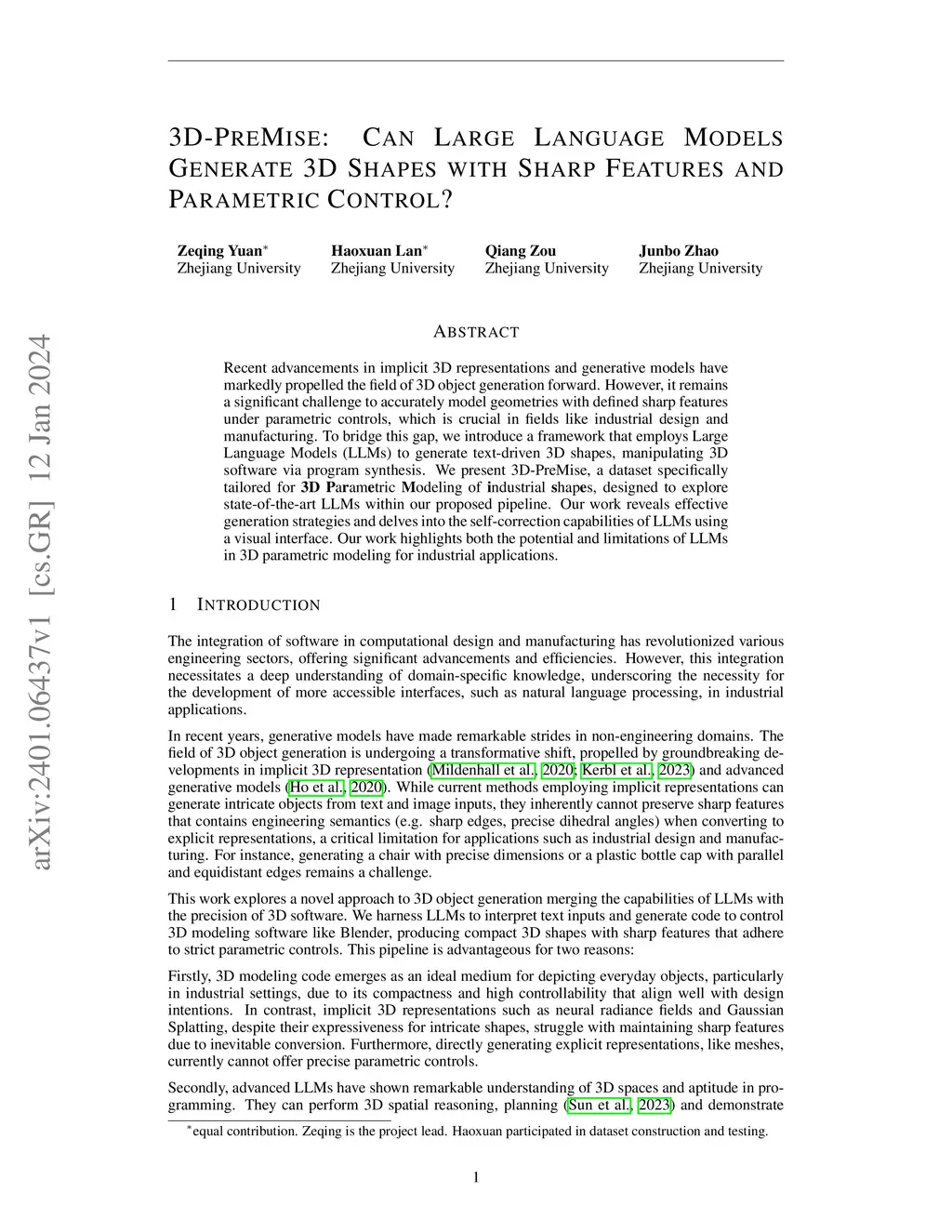 Recent advancements in implicit 3D representations and generative models have markedly propelled the field of 3D object generation forward. However, it remains a significant challenge to accurately model geometries with defined sharp features under parametric controls, which is crucial in fields like industrial design and manufacturing. To bridge this gap, we introduce a framework that employs Large Language Models (LLMs) to generate text-driven 3D shapes, manipulating 3D software via program synthesis. We present 3D-PreMise, a dataset specifically tailored for 3D parametric modeling of industrial shapes, designed to explore state-of-the-art LLMs within our proposed pipeline. Our work reveals effective generation strategies and delves into the self-correction capabilities of LLMs using a visual interface. Our work highlights both the potential and limitations of LLMs in 3D parametric modeling for industrial applications.