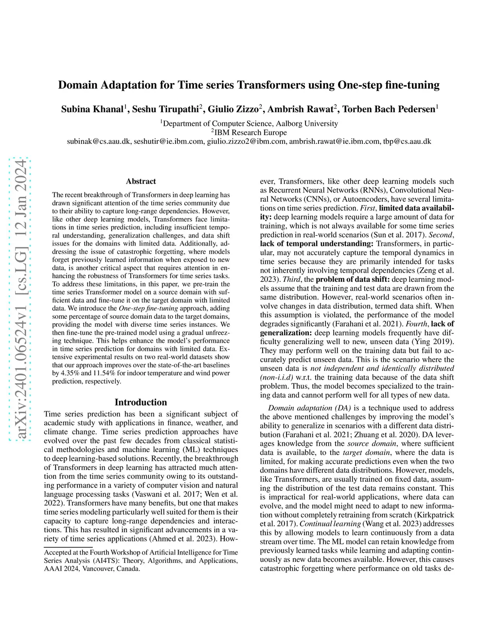 The recent breakthrough of Transformers in deep learning has drawn significant attention of the time series community due to their ability to capture long-range dependencies. However, like other deep learning models, Transformers face limitations in time series prediction, including insufficient temporal understanding, generalization challenges, and data shift issues for the domains with limited data. Additionally, addressing the issue of catastrophic forgetting, where models forget previously learned information when exposed to new data, is another critical aspect that requires attention in enhancing the robustness of Transformers for time series tasks. To address these limitations, in this paper, we pre-train the time series Transformer model on a source domain with sufficient data and fine-tune it on the target domain with limited data. We introduce the \emph{One-step fine-tuning} approach, adding some percentage of source domain data to the target domains, providing the model with diverse time series instances. We then fine-tune the pre-trained model using a gradual unfreezing technique. This helps enhance the model's performance in time series prediction for domains with limited data. Extensive experimental results on two real-world datasets show that our approach improves over the state-of-the-art baselines by 4.35% and 11.54% for indoor temperature and wind power prediction, respectively.
