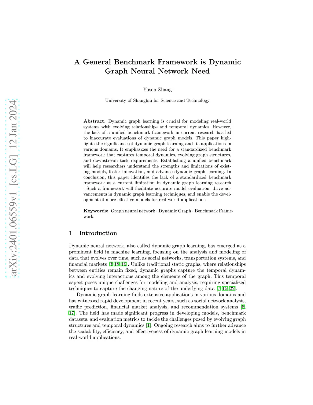 Dynamic graph learning is crucial for modeling real-world systems with evolving relationships and temporal dynamics. However, the lack of a unified benchmark framework in current research has led to inaccurate evaluations of dynamic graph models. This paper highlights the significance of dynamic graph learning and its applications in various domains. It emphasizes the need for a standardized benchmark framework that captures temporal dynamics, evolving graph structures, and downstream task requirements. Establishing a unified benchmark will help researchers understand the strengths and limitations of existing models, foster innovation, and advance dynamic graph learning. In conclusion, this paper identifies the lack of a standardized benchmark framework as a current limitation in dynamic graph learning research . Such a framework will facilitate accurate model evaluation, drive advancements in dynamic graph learning techniques, and enable the development of more effective models for real-world applications.