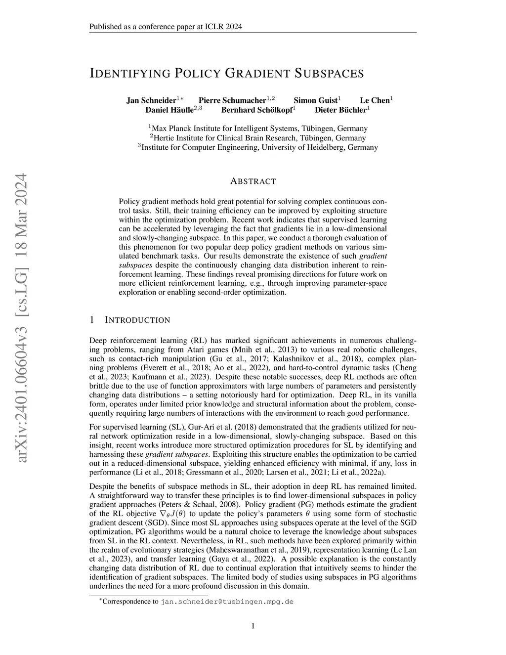 Policy gradient methods hold great potential for solving complex continuous control tasks. Still, their training efficiency can be improved by exploiting structure within the optimization problem. Recent work indicates that supervised learning can be accelerated by leveraging the fact that gradients lie in a low-dimensional and slowly-changing subspace. In this paper, we conduct a thorough evaluation of this phenomenon for two popular deep policy gradient methods on various simulated benchmark tasks. Our results demonstrate the existence of such gradient subspaces despite the continuously changing data distribution inherent to reinforcement learning. These findings reveal promising directions for future work on more efficient reinforcement learning, e.g., through improving parameter-space exploration or enabling second-order optimization.