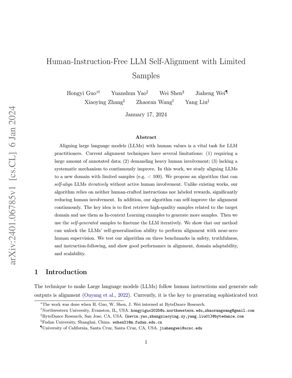 Aligning large language models (LLMs) with human values is a vital task for LLM practitioners. Current alignment techniques have several limitations: (1) requiring a large amount of annotated data; (2) demanding heavy human involvement; (3) lacking a systematic mechanism to continuously improve. In this work, we study aligning LLMs to a new domain with limited samples (e.g. < 100). We propose an algorithm that can self-align LLMs iteratively without active human involvement. Unlike existing works, our algorithm relies on neither human-crafted instructions nor labeled rewards, significantly reducing human involvement. In addition, our algorithm can self-improve the alignment continuously. The key idea is to first retrieve high-quality samples related to the target domain and use them as In-context Learning examples to generate more samples. Then we use the self-generated samples to finetune the LLM iteratively. We show that our method can unlock the LLMs' self-generalization ability to perform alignment with near-zero human supervision. We test our algorithm on three benchmarks in safety, truthfulness, and instruction-following, and show good performance in alignment, domain adaptability, and scalability.