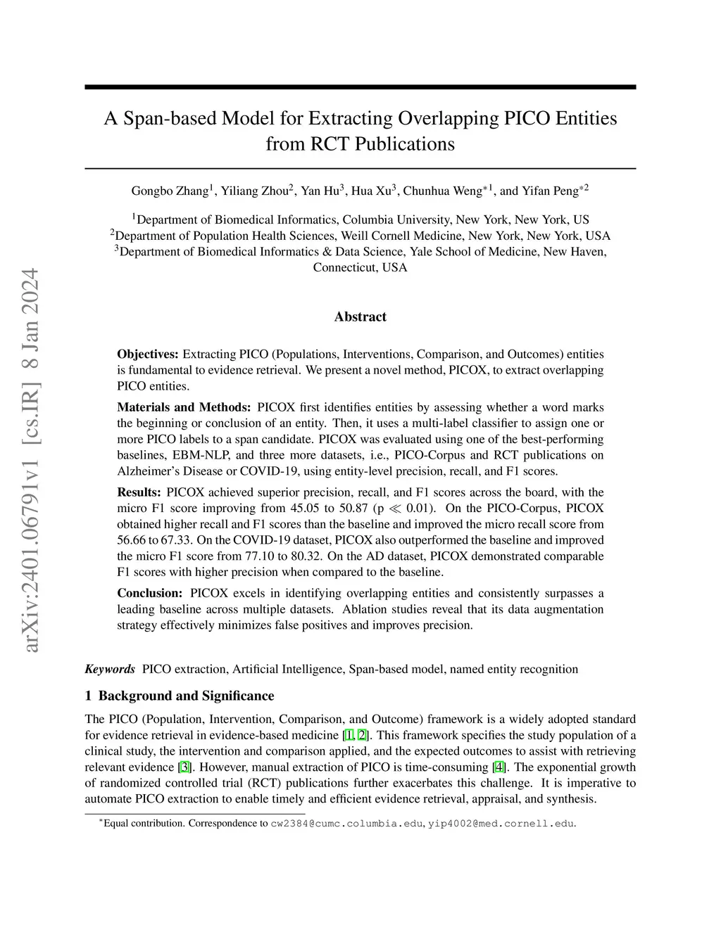 Objectives Extraction of PICO (Populations, Interventions, Comparison, and Outcomes) entities is fundamental to evidence retrieval. We present a novel method PICOX to extract overlapping PICO entities. Materials and Methods PICOX first identifies entities by assessing whether a word marks the beginning or conclusion of an entity. Then it uses a multi-label classifier to assign one or more PICO labels to a span candidate. PICOX was evaluated using one of the best-performing baselines, EBM-NLP, and three more datasets, i.e., PICO-Corpus, and RCT publications on Alzheimer's Disease or COVID-19, using entity-level precision, recall, and F1 scores. Results PICOX achieved superior precision, recall, and F1 scores across the board, with the micro F1 score improving from 45.05 to 50.87 (p << 0.01). On the PICO-Corpus, PICOX obtained higher recall and F1 scores than the baseline and improved the micro recall score from 56.66 to 67.33. On the COVID-19 dataset, PICOX also outperformed the baseline and improved the micro F1 score from 77.10 to 80.32. On the AD dataset, PICOX demonstrated comparable F1 scores with higher precision when compared to the baseline. Conclusion PICOX excels in identifying overlapping entities and consistently surpasses a leading baseline across multiple datasets. Ablation studies reveal that its data augmentation strategy effectively minimizes false positives and improves precision.