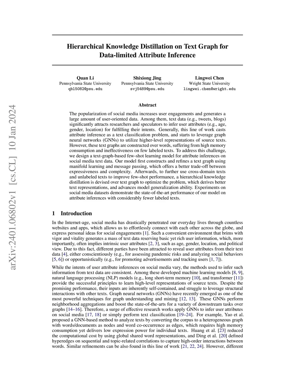 The popularization of social media increases user engagements and generates a large amount of user-oriented data. Among them, text data (e.g., tweets, blogs) significantly attracts researchers and speculators to infer user attributes (e.g., age, gender, location) for fulfilling their intents. Generally, this line of work casts attribute inference as a text classification problem, and starts to leverage graph neural networks (GNNs) to utilize higher-level representations of source texts. However, these text graphs are constructed over words, suffering from high memory consumption and ineffectiveness on few labeled texts. To address this challenge, we design a text-graph-based few-shot learning model for attribute inferences on social media text data. Our model first constructs and refines a text graph using manifold learning and message passing, which offers a better trade-off between expressiveness and complexity. Afterwards, to further use cross-domain texts and unlabeled texts to improve few-shot performance, a hierarchical knowledge distillation is devised over text graph to optimize the problem, which derives better text representations, and advances model generalization ability. Experiments on social media datasets demonstrate the state-of-the-art performance of our model on attribute inferences with considerably fewer labeled texts.