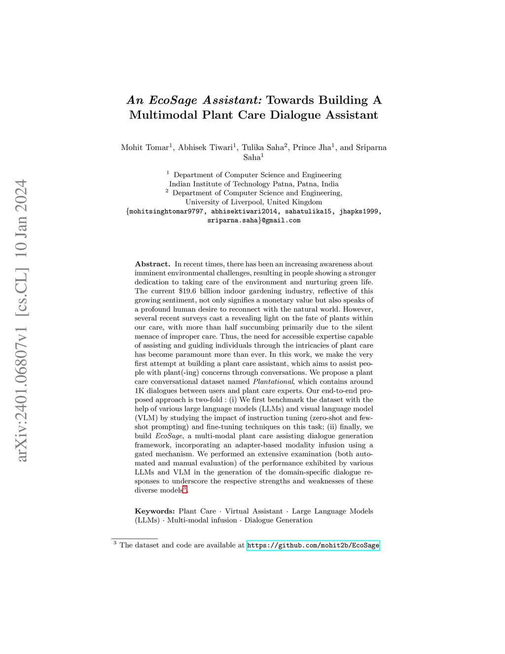 In recent times, there has been an increasing awareness about imminent environmental challenges, resulting in people showing a stronger dedication to taking care of the environment and nurturing green life. The current $19.6 billion indoor gardening industry, reflective of this growing sentiment, not only signifies a monetary value but also speaks of a profound human desire to reconnect with the natural world. However, several recent surveys cast a revealing light on the fate of plants within our care, with more than half succumbing primarily due to the silent menace of improper care. Thus, the need for accessible expertise capable of assisting and guiding individuals through the intricacies of plant care has become paramount more than ever. In this work, we make the very first attempt at building a plant care assistant, which aims to assist people with plant(-ing) concerns through conversations. We propose a plant care conversational dataset named Plantational, which contains around 1K dialogues between users and plant care experts. Our end-to-end proposed approach is two-fold : (i) We first benchmark the dataset with the help of various large language models (LLMs) and visual language model (VLM) by studying the impact of instruction tuning (zero-shot and few-shot prompting) and fine-tuning techniques on this task; (ii) finally, we build EcoSage, a multi-modal plant care assisting dialogue generation framework, incorporating an adapter-based modality infusion using a gated mechanism. We performed an extensive examination (both automated and manual evaluation) of the performance exhibited by various LLMs and VLM in the generation of the domain-specific dialogue responses to underscore the respective strengths and weaknesses of these diverse models.