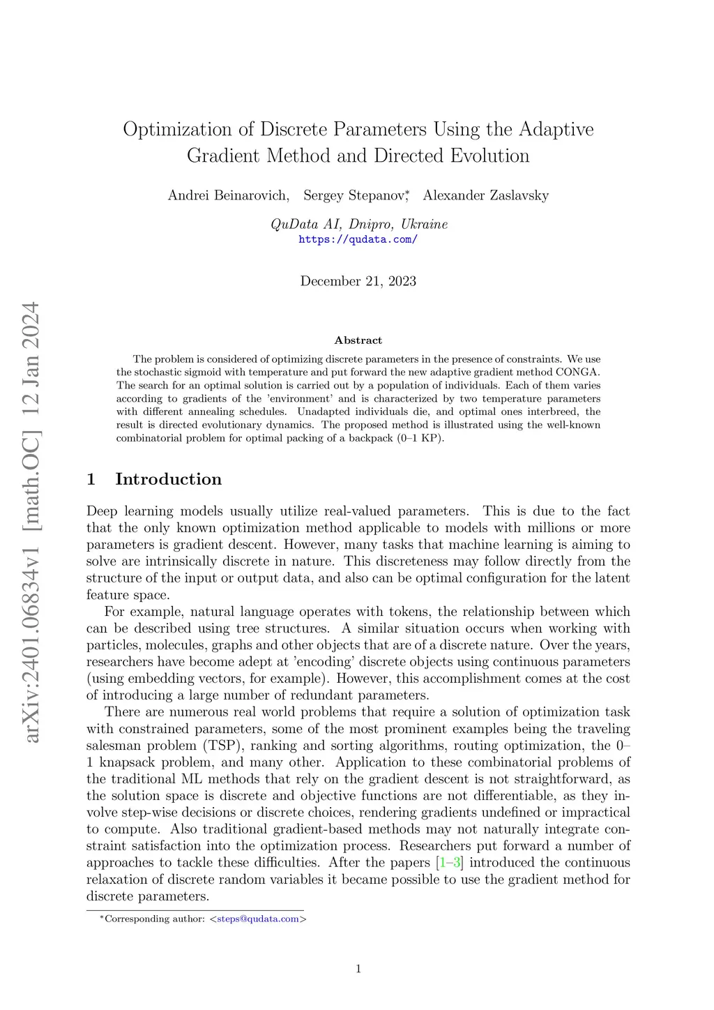 The problem is considered of optimizing discrete parameters in the presence of constraints. We use the stochastic sigmoid with temperature and put forward the new adaptive gradient method CONGA. The search for an optimal solution is carried out by a population of individuals. Each of them varies according to gradients of the énvironment' and is characterized by two temperature parameters with different annealing schedules. Unadapted individuals die, and optimal ones interbreed, the result is directed evolutionary dynamics. The proposed method is illustrated using the well-known combinatorial problem for optimal packing of a backpack (0-1 KP).