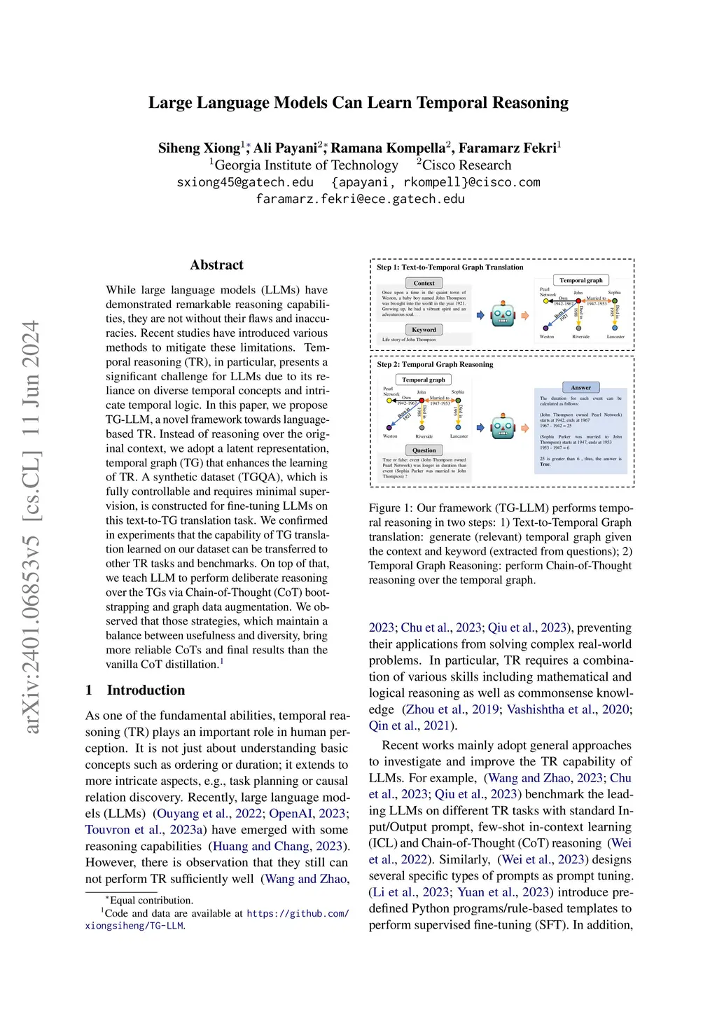 While large language models (LLMs) have demonstrated remarkable reasoning capabilities, they are not without their flaws and inaccuracies. Recent studies have introduced various methods to mitigate these limitations. Temporal reasoning (TR), in particular, presents a significant challenge for LLMs due to its reliance on diverse temporal concepts and intricate temporal logic. In this paper, we propose TG-LLM, a novel framework towards language-based TR. Instead of reasoning over the original context, we adopt a latent representation, temporal graph (TG) that enhances the learning of TR. A synthetic dataset (TGQA), which is fully controllable and requires minimal supervision, is constructed for fine-tuning LLMs on this text-to-TG translation task. We confirmed in experiments that the capability of TG translation learned on our dataset can be transferred to other TR tasks and benchmarks. On top of that, we teach LLM to perform deliberate reasoning over the TGs via Chain-of-Thought (CoT) bootstrapping and graph data augmentation. We observed that those strategies, which maintain a balance between usefulness and diversity, bring more reliable CoTs and final results than the vanilla CoT distillation.