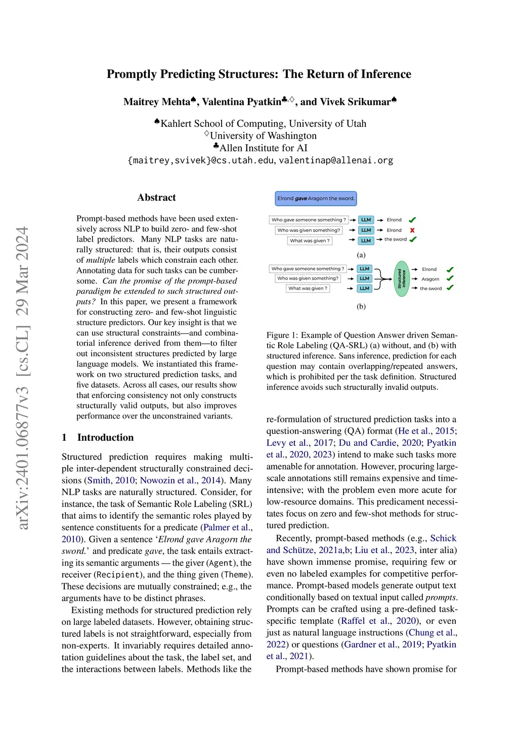 Prompt-based methods have been used extensively across NLP to build zero- and few-shot label predictors. Many NLP tasks are naturally structured: that is, their outputs consist of multiple labels which constrain each other. Annotating data for such tasks can be cumbersome. Can the promise of the prompt-based paradigm be extended to such structured outputs? In this paper, we present a framework for constructing zero- and few-shot linguistic structure predictors. Our key insight is that we can use structural constraints -- and combinatorial inference derived from them -- to filter out inconsistent structures predicted by large language models. We instantiated this framework on two structured prediction tasks, and five datasets. Across all cases, our results show that enforcing consistency not only constructs structurally valid outputs, but also improves performance over the unconstrained variants.