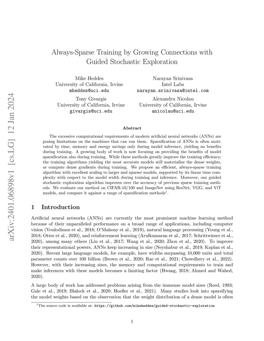 The excessive computational requirements of modern artificial neural networks (ANNs) are posing limitations on the machines that can run them. Sparsification of ANNs is often motivated by time, memory and energy savings only during model inference, yielding no benefits during training. A growing body of work is now focusing on providing the benefits of model sparsification also during training. While these methods greatly improve the training efficiency, the training algorithms yielding the most accurate models still materialize the dense weights, or compute dense gradients during training. We propose an efficient, always-sparse training algorithm with excellent scaling to larger and sparser models, supported by its linear time complexity with respect to the model width during training and inference. Moreover, our guided stochastic exploration algorithm improves over the accuracy of previous sparse training methods. We evaluate our method on CIFAR-10/100 and ImageNet using ResNet, VGG, and ViT models, and compare it against a range of sparsification methods.
