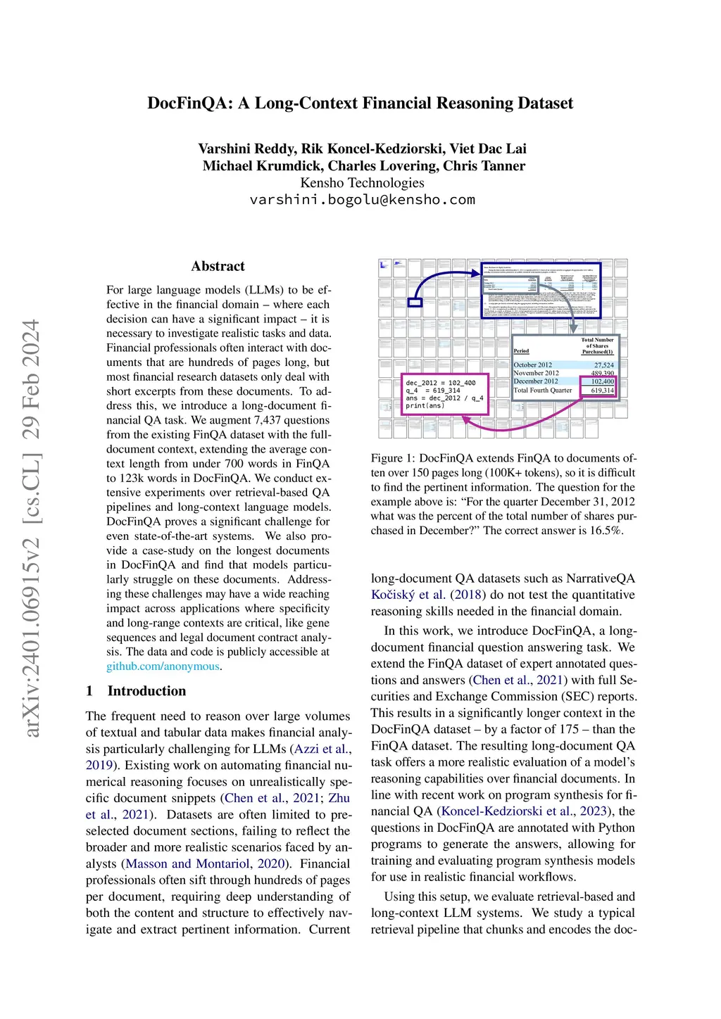 For large language models (LLMs) to be effective in the financial domain -- where each decision can have a significant impact -- it is necessary to investigate realistic tasks and data. Financial professionals often interact with documents that are hundreds of pages long, but most financial research datasets only deal with short excerpts from these documents. To address this, we introduce a long-document financial QA task. We augment 7,437 questions from the existing FinQA dataset with the full-document context, extending the average context length from under 700 words in FinQA to 123k words in DocFinQA. We conduct extensive experiments over retrieval-based QA pipelines and long-context language models. DocFinQA proves a significant challenge for even state-of-the-art systems. We also provide a case-study on the longest documents in DocFinQA and find that models particularly struggle on these documents. Addressing these challenges may have a wide reaching impact across applications where specificity and long-range contexts are critical, like gene sequences and legal document contract analysis.