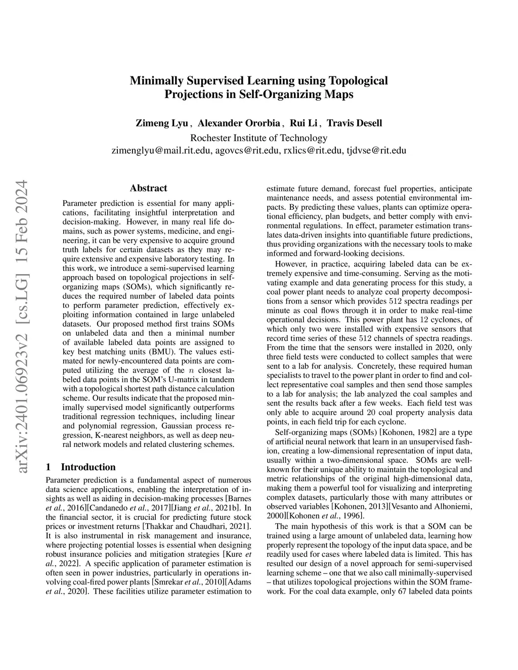 Parameter prediction is essential for many applications, facilitating insightful interpretation and decision-making. However, in many real life domains, such as power systems, medicine, and engineering, it can be very expensive to acquire ground truth labels for certain datasets as they may require extensive and expensive laboratory testing. In this work, we introduce a semi-supervised learning approach based on topological projections in self-organizing maps (SOMs), which significantly reduces the required number of labeled data points to perform parameter prediction, effectively exploiting information contained in large unlabeled datasets. Our proposed method first trains SOMs on unlabeled data and then a minimal number of available labeled data points are assigned to key best matching units (BMU). The values estimated for newly-encountered data points are computed utilizing the average of the closest labeled data points in the SOM's U-matrix in tandem with a topological shortest path distance calculation scheme. Our results indicate that the proposed minimally supervised model significantly outperforms traditional regression techniques, including linear and polynomial regression, Gaussian process regression, K-nearest neighbors, as well as deep neural network models and related clustering schemes.