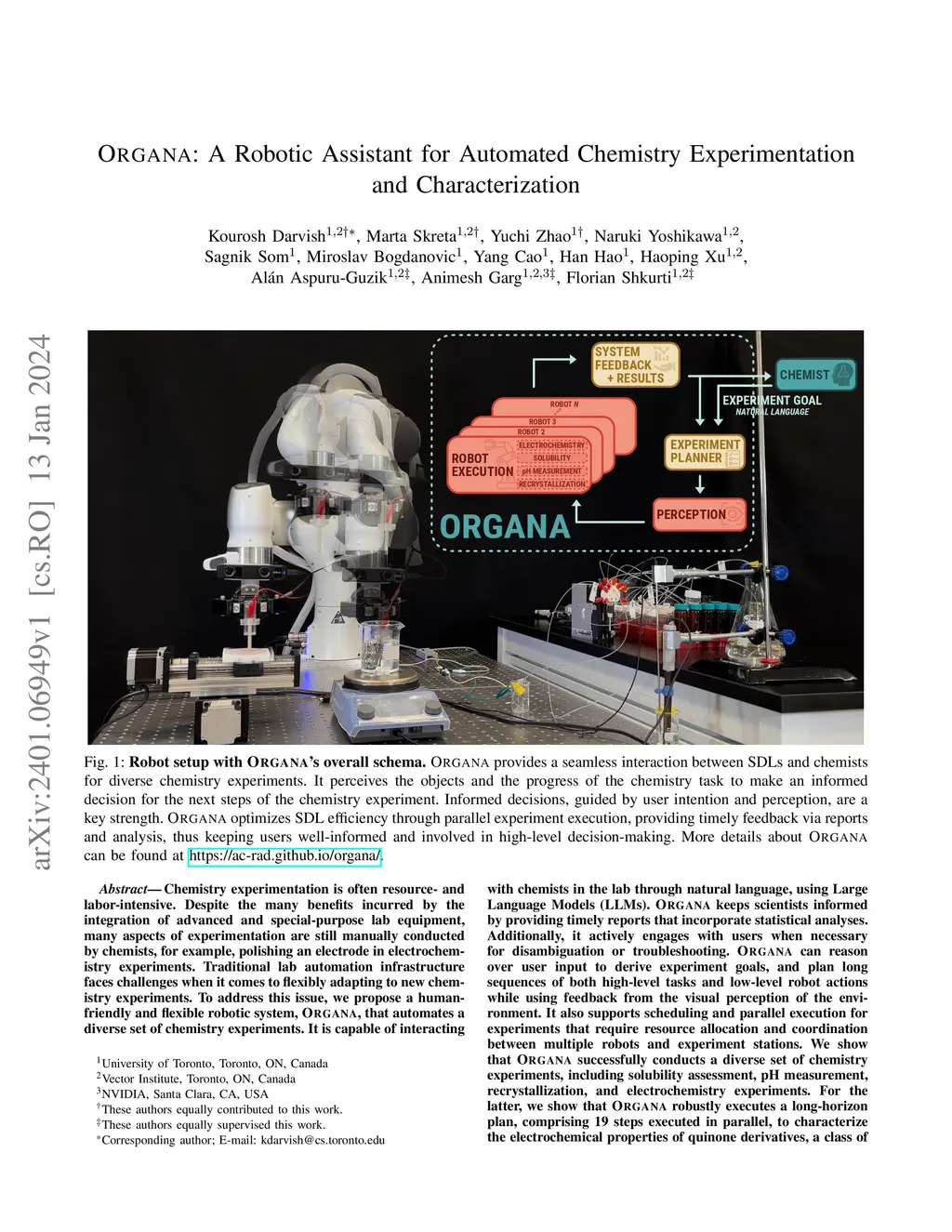Chemistry experiments can be resource- and labor-intensive, often requiring manual tasks like polishing electrodes in electrochemistry. Traditional lab automation infrastructure faces challenges adapting to new experiments. To address this, we introduce ORGANA, an assistive robotic system that automates diverse chemistry experiments using decision-making and perception tools. It makes decisions with chemists in the loop to control robots and lab devices. ORGANA interacts with chemists using Large Language Models (LLMs) to derive experiment goals, handle disambiguation, and provide experiment logs. ORGANA plans and executes complex tasks with visual feedback, while supporting scheduling and parallel task execution. We demonstrate ORGANA's capabilities in solubility, pH measurement, recrystallization, and electrochemistry experiments. In electrochemistry, it executes a 19-step plan in parallel to characterize quinone derivatives for flow batteries. Our user study shows ORGANA reduces frustration and physical demand by over 50%, with users saving an average of 80.3% of their time when using it.