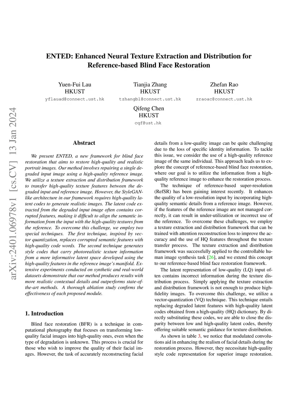 We present ENTED, a new framework for blind face restoration that aims to restore high-quality and realistic portrait images. Our method involves repairing a single degraded input image using a high-quality reference image. We utilize a texture extraction and distribution framework to transfer high-quality texture features between the degraded input and reference image. However, the StyleGAN-like architecture in our framework requires high-quality latent codes to generate realistic images. The latent code extracted from the degraded input image often contains corrupted features, making it difficult to align the semantic information from the input with the high-quality textures from the reference. To overcome this challenge, we employ two special techniques. The first technique, inspired by vector quantization, replaces corrupted semantic features with high-quality code words. The second technique generates style codes that carry photorealistic texture information from a more informative latent space developed using the high-quality features in the reference image's manifold. Extensive experiments conducted on synthetic and real-world datasets demonstrate that our method produces results with more realistic contextual details and outperforms state-of-the-art methods. A thorough ablation study confirms the effectiveness of each proposed module.