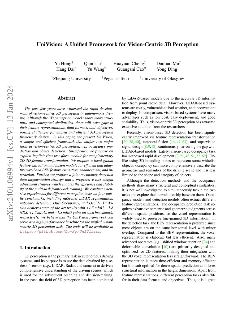 UniVision: A Unified Framework for Vision-Centric 3D Perception