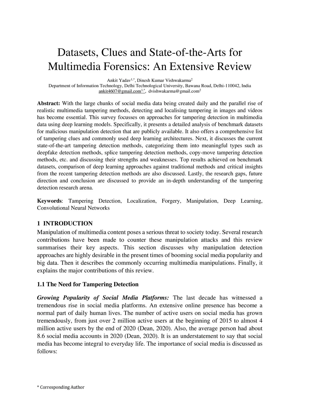 With the large chunks of social media data being created daily and the parallel rise of realistic multimedia tampering methods, detecting and localising tampering in images and videos has become essential. This survey focusses on approaches for tampering detection in multimedia data using deep learning models. Specifically, it presents a detailed analysis of benchmark datasets for malicious manipulation detection that are publicly available. It also offers a comprehensive list of tampering clues and commonly used deep learning architectures. Next, it discusses the current state-of-the-art tampering detection methods, categorizing them into meaningful types such as deepfake detection methods, splice tampering detection methods, copy-move tampering detection methods, etc. and discussing their strengths and weaknesses. Top results achieved on benchmark datasets, comparison of deep learning approaches against traditional methods and critical insights from the recent tampering detection methods are also discussed. Lastly, the research gaps, future direction and conclusion are discussed to provide an in-depth understanding of the tampering detection research arena.