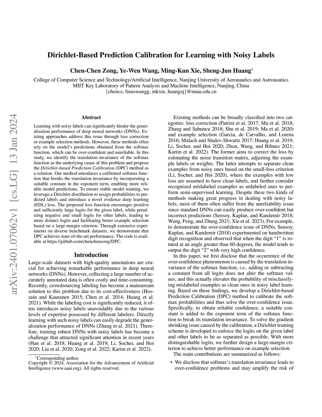Learning with noisy labels can significantly hinder the generalization performance of deep neural networks (DNNs). Existing approaches address this issue through loss correction or example selection methods. However, these methods often rely on the model's predictions obtained from the softmax function, which can be over-confident and unreliable. In this study, we identify the translation invariance of the softmax function as the underlying cause of this problem and propose the \textit{Dirichlet-based Prediction Calibration} (DPC) method as a solution. Our method introduces a calibrated softmax function that breaks the translation invariance by incorporating a suitable constant in the exponent term, enabling more reliable model predictions. To ensure stable model training, we leverage a Dirichlet distribution to assign probabilities to predicted labels and introduce a novel evidence deep learning (EDL) loss. The proposed loss function encourages positive and sufficiently large logits for the given label, while penalizing negative and small logits for other labels, leading to more distinct logits and facilitating better example selection based on a large-margin criterion. Through extensive experiments on diverse benchmark datasets, we demonstrate that DPC achieves state-of-the-art performance. The code is available at https://github.com/chenchenzong/DPC.