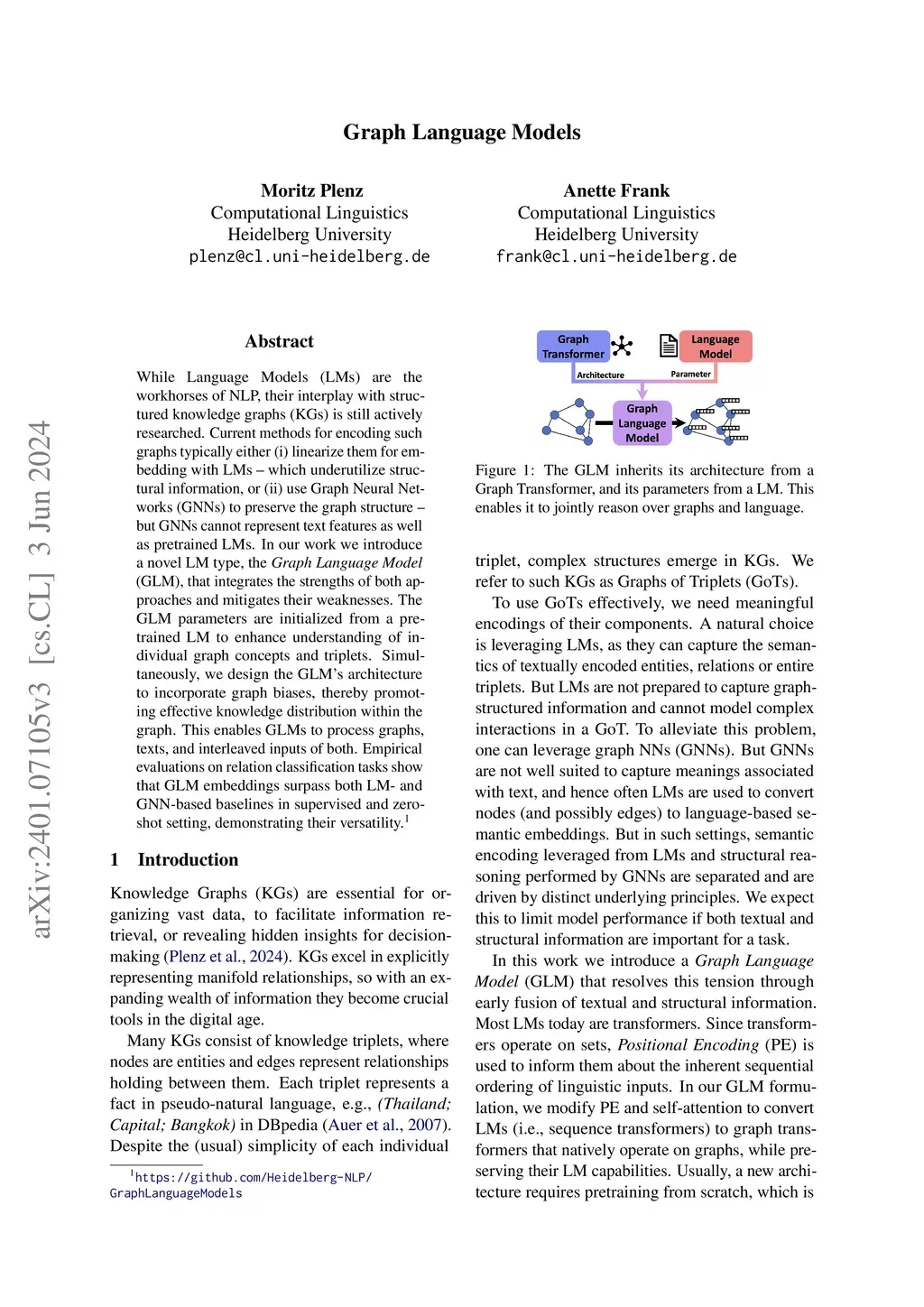 While Language Models (LMs) are the workhorses of NLP, their interplay with structured knowledge graphs (KGs) is still actively researched. Current methods for encoding such graphs typically either (i) linearize them for embedding with LMs -- which underutilize structural information, or (ii) use Graph Neural Networks (GNNs) to preserve the graph structure -- but GNNs cannot represent text features as well as pretrained LMs. In our work we introduce a novel LM type, the Graph Language Model (GLM), that integrates the strengths of both approaches and mitigates their weaknesses. The GLM parameters are initialized from a pretrained LM to enhance understanding of individual graph concepts and triplets. Simultaneously, we design the GLM's architecture to incorporate graph biases, thereby promoting effective knowledge distribution within the graph. This enables GLMs to process graphs, texts, and interleaved inputs of both. Empirical evaluations on relation classification tasks show that GLM embeddings surpass both LM- and GNN-based baselines in supervised and zero-shot setting, demonstrating their versatility.