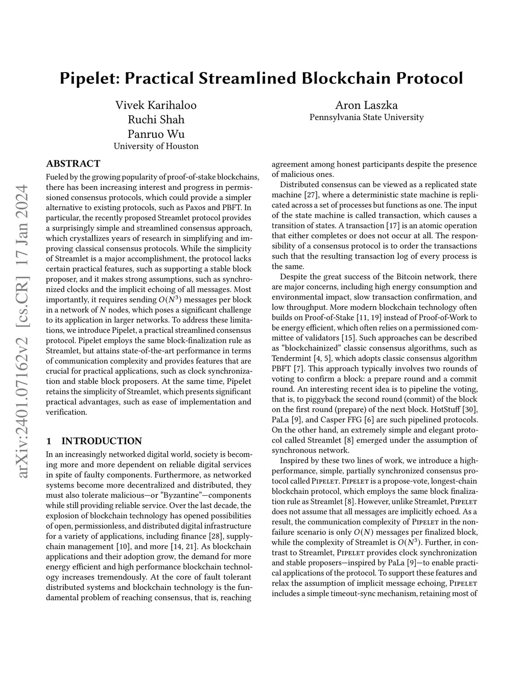 Fueled by the growing popularity of proof-of-stake blockchains, there has been increasing interest and progress in permissioned consensus protocols, which could provide a simpler alternative to existing protocols, such as Paxos and PBFT. In particular, the recently proposed Streamlet protocol provides a surprisingly simple and streamlined consensus approach, which crystallizes years of research in simplifying and improving classical consensus protocols. While the simplicity of Streamlet is a major accomplishment, the protocol lacks certain practical features, such as supporting a stable block proposer, and it makes strong assumptions, such as synchronized clocks and the implicit echoing of all messages. Most importantly, it requires sending messages per block in a network of nodes, which poses a significant challenge to its application in larger networks. To address these limitations, we introduce Pipelet, a practical streamlined consensus protocol. Pipelet employs the same block-finalization rule as Streamlet, but attains state-of-the-art performance in terms of communication complexity and provides features that are crucial for practical applications, such as clock synchronization and stable block proposers. At the same time, Pipelet retains the simplicity of Streamlet, which presents significant practical advantages, such as ease of implementation and verification.