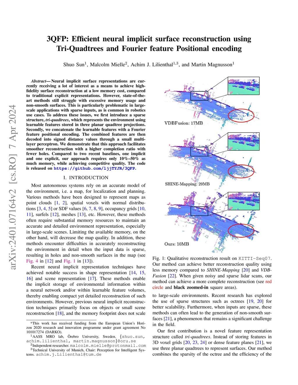 Neural implicit surface representations are currently receiving a lot of interest as a means to achieve high-fidelity surface reconstruction at a low memory cost, compared to traditional explicit representations.However, state-of-the-art methods still struggle with excessive memory usage and non-smooth surfaces. This is particularly problematic in large-scale applications with sparse inputs, as is common in robotics use cases. To address these issues, we first introduce a sparse structure, \emph{tri-quadtrees}, which represents the environment using learnable features stored in three planar quadtree projections. Secondly, we concatenate the learnable features with a Fourier feature positional encoding. The combined features are then decoded into signed distance values through a small multi-layer perceptron. We demonstrate that this approach facilitates smoother reconstruction with a higher completion ratio with fewer holes. Compared to two recent baselines, one implicit and one explicit, our approach requires only 10\%--50\% as much memory, while achieving competitive quality.