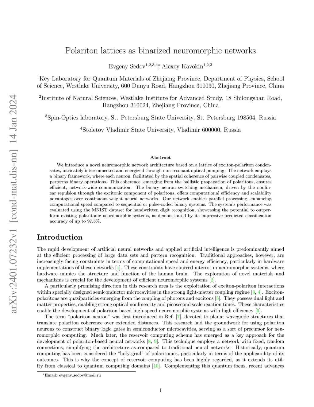 We introduce a novel neuromorphic network architecture based on a lattice of exciton-polariton condensates, intricately interconnected and energized through non-resonant optical pumping. The network employs a binary framework, where each neuron, facilitated by the spatial coherence of pairwise coupled condensates, performs binary operations. This coherence, emerging from the ballistic propagation of polaritons, ensures efficient, network-wide communication. The binary neuron switching mechanism, driven by the nonlinear repulsion through the excitonic component of polaritons, offers computational efficiency and scalability advantages over continuous weight neural networks. Our network enables parallel processing, enhancing computational speed compared to sequential or pulse-coded binary systems. The system's performance was evaluated using the MNIST dataset for handwritten digit recognition, showcasing the potential to outperform existing polaritonic neuromorphic systems, as demonstrated by its impressive predicted classification accuracy of up to 97.5%.