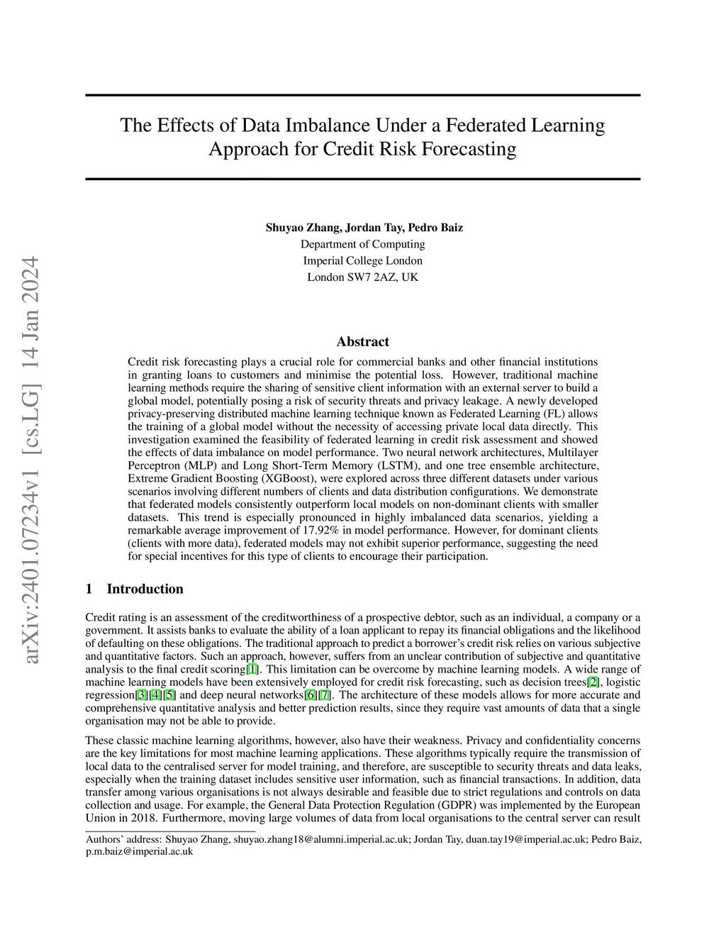 Credit risk forecasting plays a crucial role for commercial banks and other financial institutions in granting loans to customers and minimise the potential loss. However, traditional machine learning methods require the sharing of sensitive client information with an external server to build a global model, potentially posing a risk of security threats and privacy leakage. A newly developed privacy-preserving distributed machine learning technique known as Federated Learning (FL) allows the training of a global model without the necessity of accessing private local data directly. This investigation examined the feasibility of federated learning in credit risk assessment and showed the effects of data imbalance on model performance. Two neural network architectures, Multilayer Perceptron (MLP) and Long Short-Term Memory (LSTM), and one tree ensemble architecture, Extreme Gradient Boosting (XGBoost), were explored across three different datasets under various scenarios involving different numbers of clients and data distribution configurations. We demonstrate that federated models consistently outperform local models on non-dominant clients with smaller datasets. This trend is especially pronounced in highly imbalanced data scenarios, yielding a remarkable average improvement of 17.92% in model performance. However, for dominant clients (clients with more data), federated models may not exhibit superior performance, suggesting the need for special incentives for this type of clients to encourage their participation.