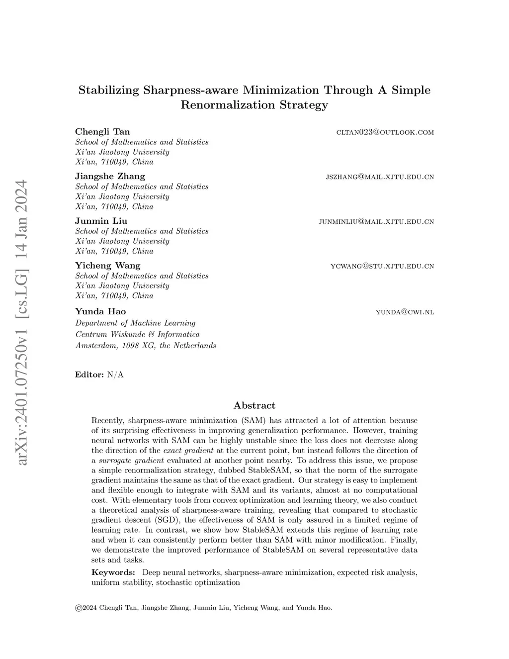Recently, sharpness-aware minimization (SAM) has attracted a lot of attention because of its surprising effectiveness in improving generalization performance.However, training neural networks with SAM can be highly unstable since the loss does not decrease along the direction of the exact gradient at the current point, but instead follows the direction of a surrogate gradient evaluated at another point nearby. To address this issue, we propose a simple renormalization strategy, dubbed StableSAM, so that the norm of the surrogate gradient maintains the same as that of the exact gradient. Our strategy is easy to implement and flexible enough to integrate with SAM and its variants, almost at no computational cost. With elementary tools from convex optimization and learning theory, we also conduct a theoretical analysis of sharpness-aware training, revealing that compared to stochastic gradient descent (SGD), the effectiveness of SAM is only assured in a limited regime of learning rate. In contrast, we show how StableSAM extends this regime of learning rate and when it can consistently perform better than SAM with minor modification. Finally, we demonstrate the improved performance of StableSAM on several representative data sets and tasks.