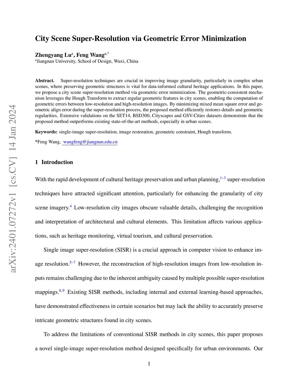 Super-resolution techniques are crucial in improving image granularity, particularly in complex urban scenes, where preserving geometric structures is vital for data-informed cultural heritage applications. In this paper, we propose a city scene super-resolution method via geometric error minimization. The geometric-consistent mechanism leverages the Hough Transform to extract regular geometric features in city scenes, enabling the computation of geometric errors between low-resolution and high-resolution images. By minimizing mixed mean square error and geometric align error during the super-resolution process, the proposed method efficiently restores details and geometric regularities. Extensive validations on the SET14, BSD300, Cityscapes and GSV-Cities datasets demonstrate that the proposed method outperforms existing state-of-the-art methods, especially in urban scenes.