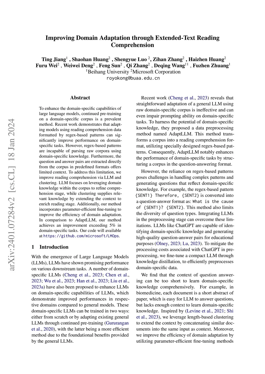 To enhance the domain-specific capabilities of large language models, continued pre-training on a domain-specific corpus is a prevalent method. Recent work demonstrates that adapting models using reading comprehension data formatted by regex-based patterns can significantly improve performance on domain-specific tasks. However, regex-based patterns are incapable of parsing raw corpora using domain-specific knowledge. Furthermore, the question and answer pairs are extracted directly from the corpus in predefined formats offers limited context. To address this limitation, we improve reading comprehension via LLM and clustering. LLM focuses on leveraging domain knowledge within the corpus to refine comprehension stage, while clustering supplies relevant knowledge by extending the context to enrich reading stage. Additionally, our method incorporates parameter-efficient fine-tuning to improve the efficiency of domain adaptation. In comparison to AdaptLLM, our method achieves an improvement exceeding 5% in domain-specific tasks. Our code will available at https://github.com/microsoft/LMOps.