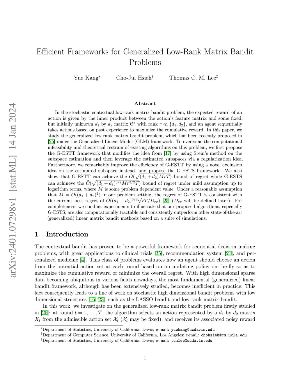 In the stochastic contextual low-rank matrix bandit problem, the expected reward of an action is given by the inner product between the action's feature matrix and some fixed, but initially unknown by matrix with rank , and an agent sequentially takes actions based on past experience to maximize the cumulative reward. In this paper, we study the generalized low-rank matrix bandit problem, which has been recently proposed in \cite{lu2021low} under the Generalized Linear Model (GLM) framework. To overcome the computational infeasibility and theoretical restrain of existing algorithms on this problem, we first propose the G-ESTT framework that modifies the idea from \cite{jun2019bilinear} by using Stein's method on the subspace estimation and then leverage the estimated subspaces via a regularization idea. Furthermore, we remarkably improve the efficiency of G-ESTT by using a novel exclusion idea on the estimated subspace instead, and propose the G-ESTS framework. We also show that G-ESTT can achieve the bound of regret while G-ESTS can achineve the bound of regret under mild assumption up to logarithm terms, where is some problem dependent value. Under a reasonable assumption that in our problem setting, the regret of G-ESTT is consistent with the current best regret of ~\citep{lu2021low} ( will be defined later). For completeness, we conduct experiments to illustrate that our proposed algorithms, especially G-ESTS, are also computationally tractable and consistently outperform other state-of-the-art (generalized) linear matrix bandit methods based on a suite of simulations.