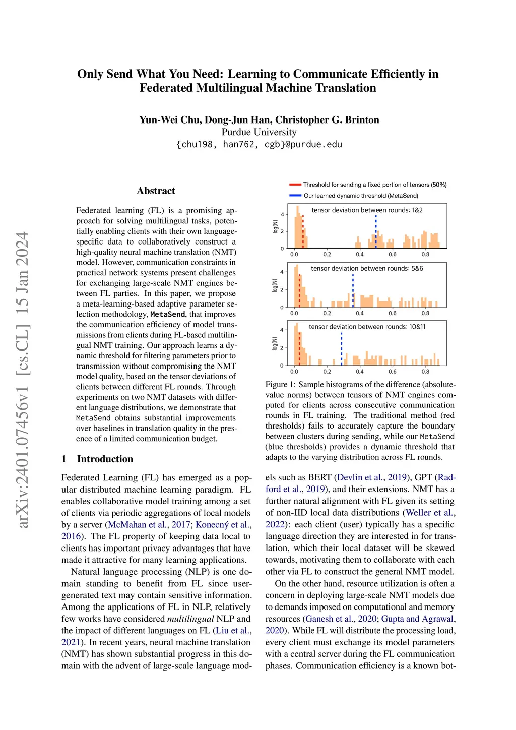 Federated learning (FL) is a promising distributed machine learning paradigm that enables multiple clients to collaboratively train a global model. In this paper, we focus on a practical federated multilingual learning setup where clients with their own language-specific data aim to collaboratively construct a high-quality neural machine translation (NMT) model. However, communication constraints in practical network systems present challenges for exchanging large-scale NMT engines between FL parties. We propose a meta-learning-based adaptive parameter selection methodology, MetaSend, that improves the communication efficiency of model transmissions from clients during FL-based multilingual NMT training. Our approach learns a dynamic threshold for filtering parameters prior to transmission without compromising the NMT model quality, based on the tensor deviations of clients between different FL rounds. Through experiments on two NMT datasets with different language distributions, we demonstrate that MetaSend obtains substantial improvements over baselines in translation quality in the presence of a limited communication budget.