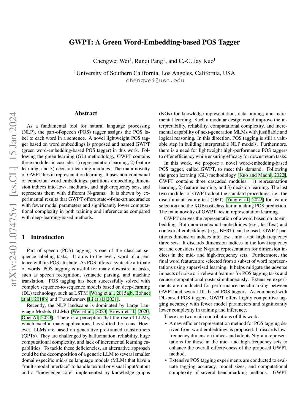 As a fundamental tool for natural language processing (NLP), the part-of-speech (POS) tagger assigns the POS label to each word in a sentence. A novel lightweight POS tagger based on word embeddings is proposed and named GWPT (green word-embedding-based POS tagger) in this work. Following the green learning (GL) methodology, GWPT contains three modules in cascade: 1) representation learning, 2) feature learning, and 3) decision learning modules. The main novelty of GWPT lies in representation learning. It uses non-contextual or contextual word embeddings, partitions embedding dimension indices into low-, medium-, and high-frequency sets, and represents them with different N-grams. It is shown by experimental results that GWPT offers state-of-the-art accuracies with fewer model parameters and significantly lower computational complexity in both training and inference as compared with deep-learning-based methods.