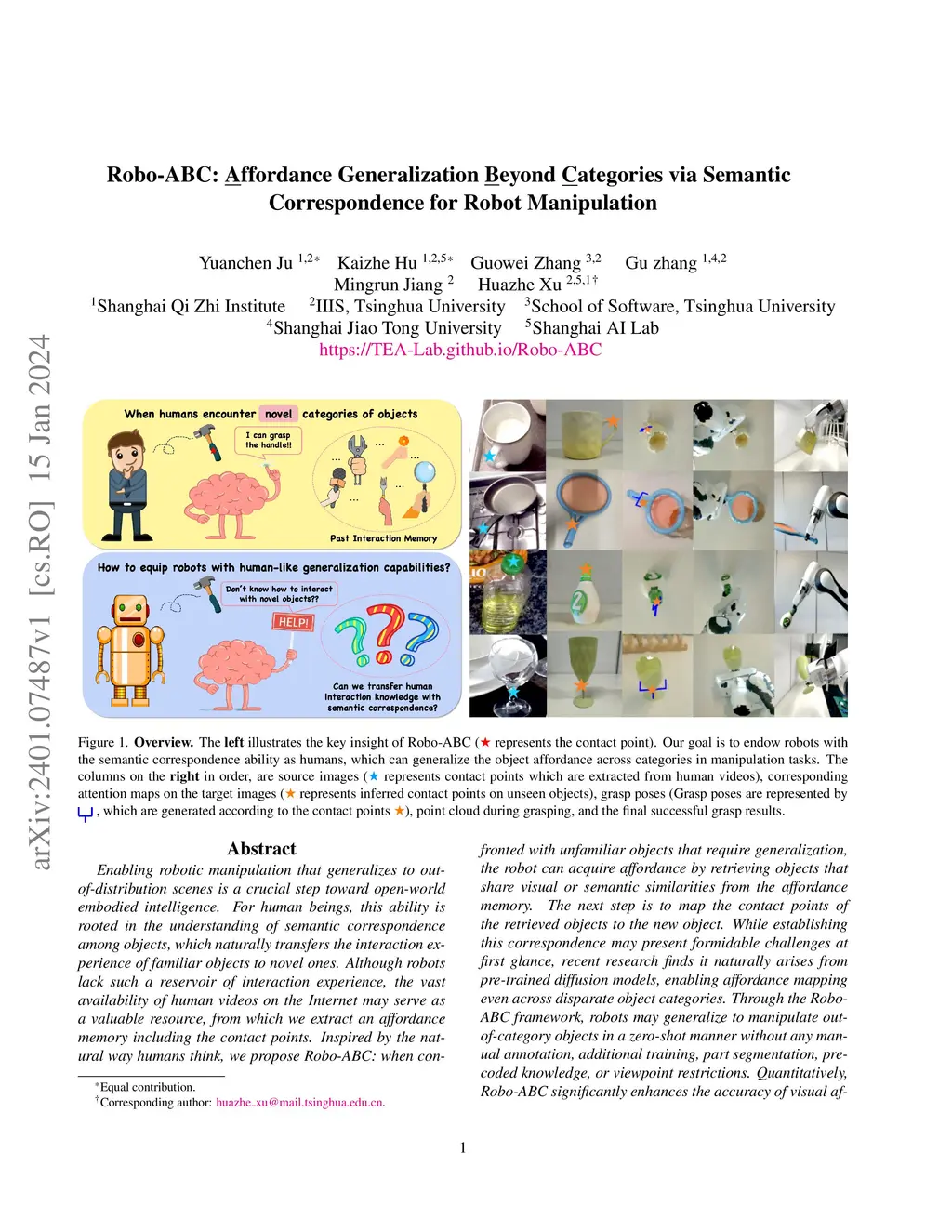 Enabling robotic manipulation that generalizes to out-of-distribution scenes is a crucial step toward open-world embodied intelligence. For human beings, this ability is rooted in the understanding of semantic correspondence among objects, which naturally transfers the interaction experience of familiar objects to novel ones. Although robots lack such a reservoir of interaction experience, the vast availability of human videos on the Internet may serve as a valuable resource, from which we extract an affordance memory including the contact points. Inspired by the natural way humans think, we propose Robo-ABC: when confronted with unfamiliar objects that require generalization, the robot can acquire affordance by retrieving objects that share visual or semantic similarities from the affordance memory. The next step is to map the contact points of the retrieved objects to the new object. While establishing this correspondence may present formidable challenges at first glance, recent research finds it naturally arises from pre-trained diffusion models, enabling affordance mapping even across disparate object categories. Through the Robo-ABC framework, robots may generalize to manipulate out-of-category objects in a zero-shot manner without any manual annotation, additional training, part segmentation, pre-coded knowledge, or viewpoint restrictions. Quantitatively, Robo-ABC significantly enhances the accuracy of visual affordance retrieval by a large margin of 31.6% compared to state-of-the-art (SOTA) end-to-end affordance models. We also conduct real-world experiments of cross-category object-grasping tasks. Robo-ABC achieved a success rate of 85.7%, proving its capacity for real-world tasks.