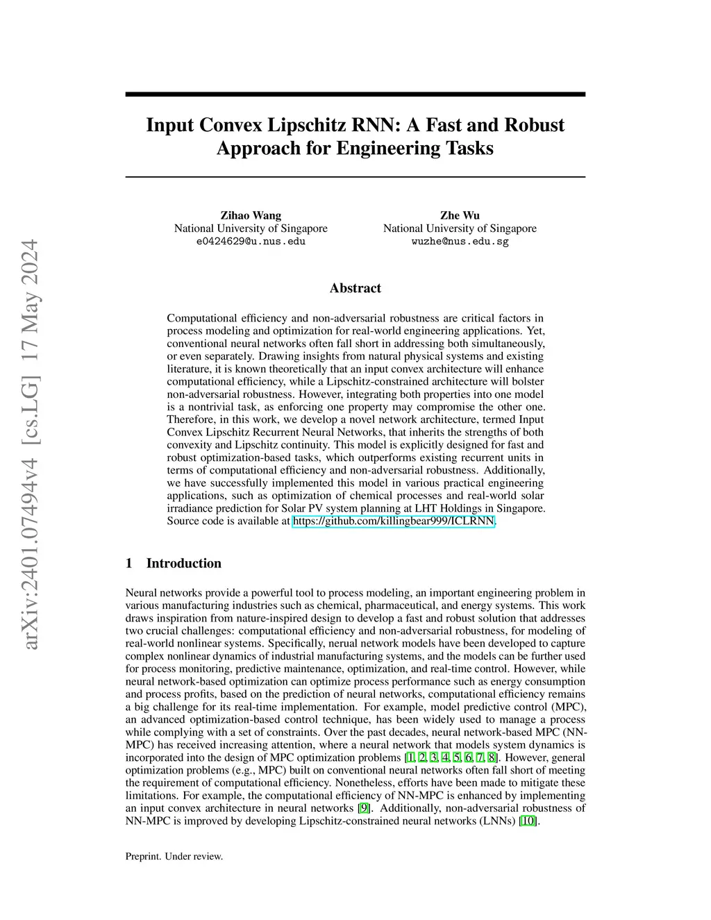 Computational efficiency and non-adversarial robustness are critical factors in process modeling and optimization for real-world engineering applications. Yet, conventional neural networks often fall short in addressing both simultaneously, or even separately. Drawing insights from natural physical systems and existing literature, it is known theoretically that an input convex architecture will enhance computational efficiency, while a Lipschitz-constrained architecture will bolster non-adversarial robustness. However, integrating both properties into one model is a nontrivial task, as enforcing one property may compromise the other one. Therefore, in this work, we develop a novel network architecture, termed Input Convex Lipschitz Recurrent Neural Networks, that inherits the strengths of both convexity and Lipschitz continuity. This model is explicitly designed for fast and robust optimization-based tasks, which outperforms existing recurrent units in terms of computational efficiency and non-adversarial robustness. Additionally, we have successfully implemented this model in various practical engineering applications, such as optimization of chemical processes and real-world solar irradiance prediction for Solar PV system planning at LHT Holdings in Singapore. Source code is available at https://github.com/killingbear999/ICLRNN.