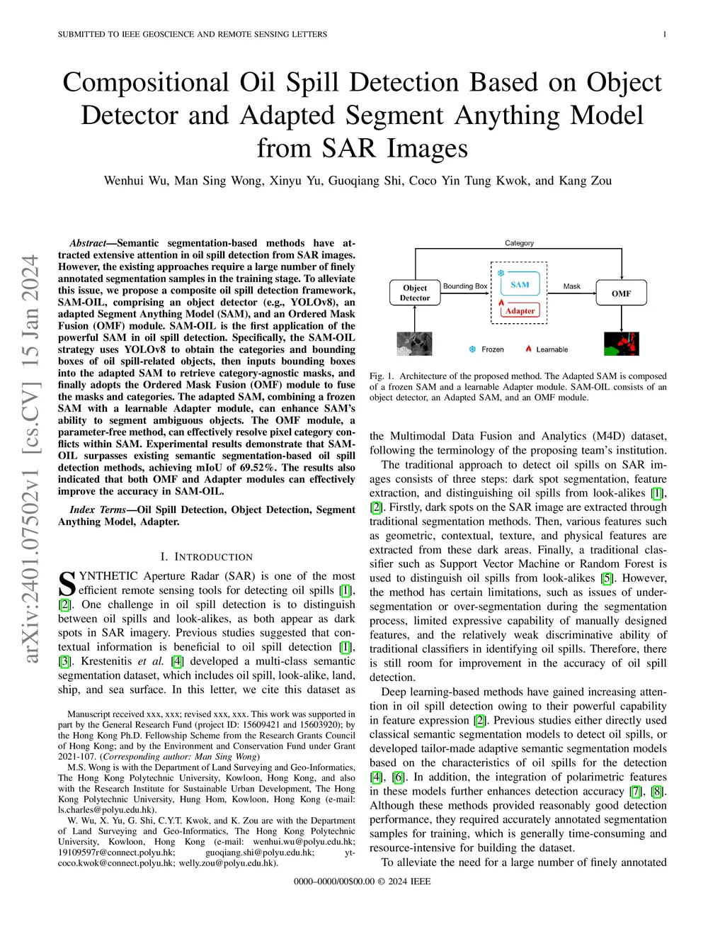 Semantic segmentation-based methods have attracted extensive attention in oil spill detection from SAR images. However, the existing approaches require a large number of finely annotated segmentation samples in the training stage. To alleviate this issue, we propose a composite oil spill detection framework, SAM-OIL, comprising an object detector (e.g., YOLOv8), an adapted Segment Anything Model (SAM), and an Ordered Mask Fusion (OMF) module. SAM-OIL is the first application of the powerful SAM in oil spill detection. Specifically, the SAM-OIL strategy uses YOLOv8 to obtain the categories and bounding boxes of oil spill-related objects, then inputs bounding boxes into the adapted SAM to retrieve category-agnostic masks, and finally adopts the Ordered Mask Fusion (OMF) module to fuse the masks and categories. The adapted SAM, combining a frozen SAM with a learnable Adapter module, can enhance SAM's ability to segment ambiguous objects. The OMF module, a parameter-free method, can effectively resolve pixel category conflicts within SAM. Experimental results demonstrate that SAM-OIL surpasses existing semantic segmentation-based oil spill detection methods, achieving mIoU of 69.52%. The results also indicated that both OMF and Adapter modules can effectively improve the accuracy in SAM-OIL.